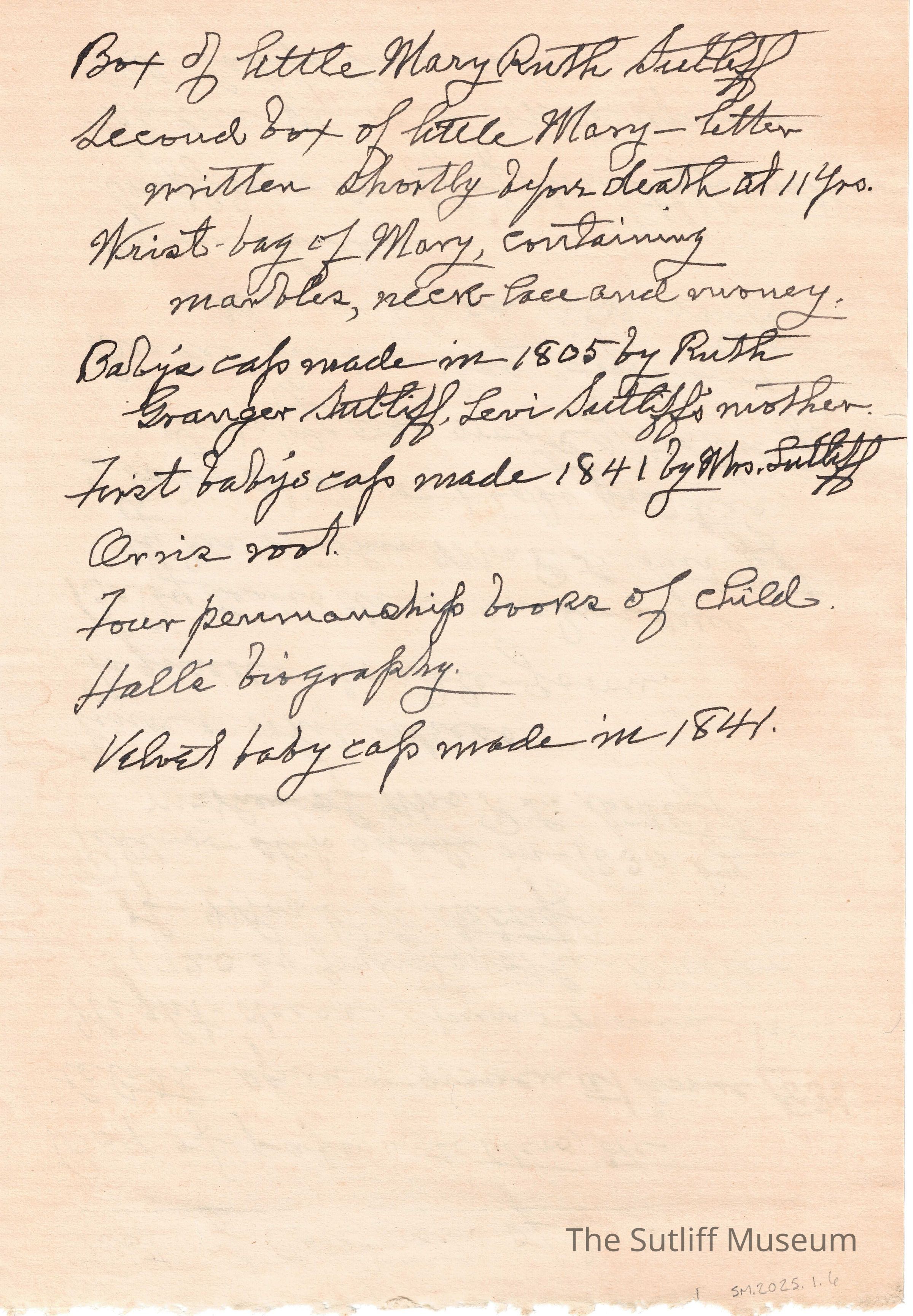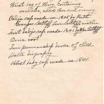 List made by Phebe T. Sutliff regarding the contents of a box.Relationships