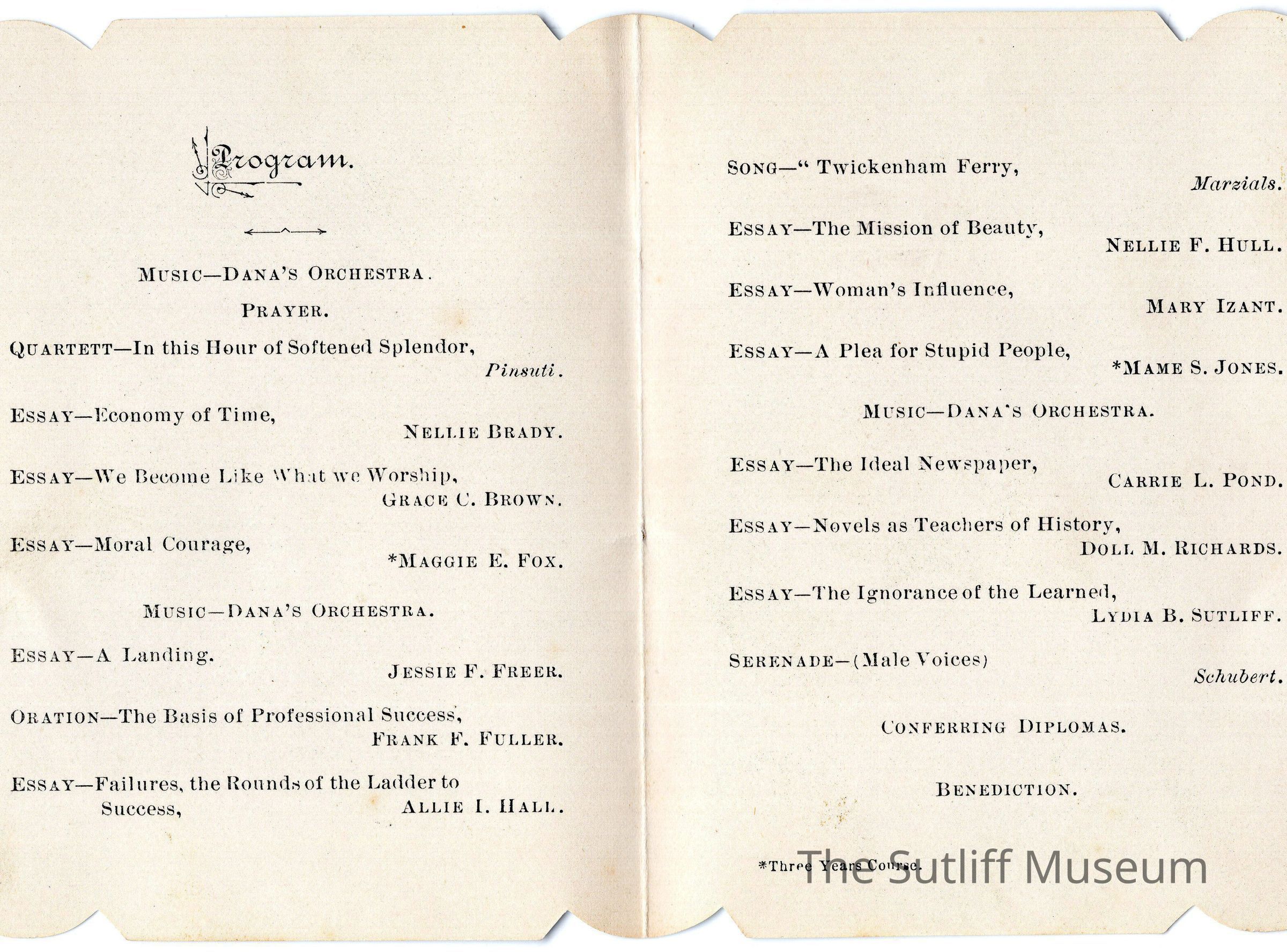 Inside lists the speeches and musical entertainment for the night, including an essay by Lydia B. Sutliff. This speech is SM1971.11.52.
