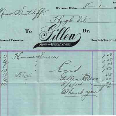 A receipt to Phebe Temperance Sutliff from Gillen Auto and Vehicle Livery for completing payment associated with Phebe Lord Marvin Sutliff's death receipts.Collection