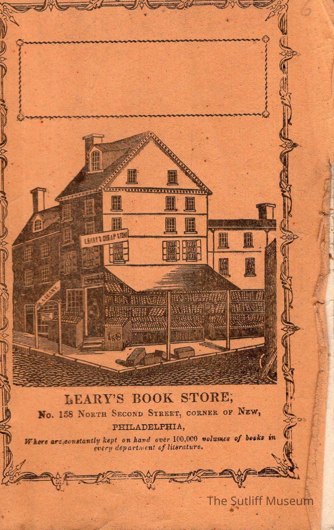 Levi Sutliff's ledger book written in notebook advertising Leary's Book Store, No. 158 North Second Street, Corner of New Philadelphia Tan paperback book with notebook paper inside.