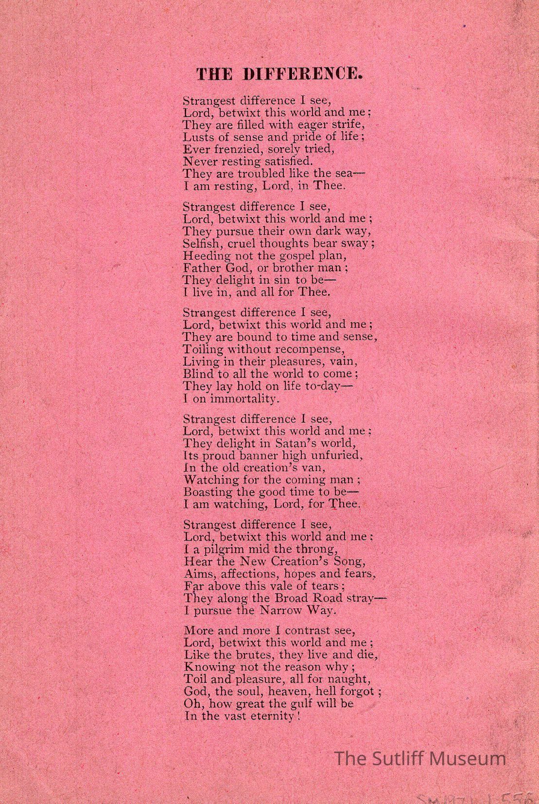 The Church and the World as seen in The New Testament delivered by E. P. Marvin on August 25, 1887. Booklet contains information on the role of the church within the world as seen in The New Testament. The back cover has a verse titled "The Difference"