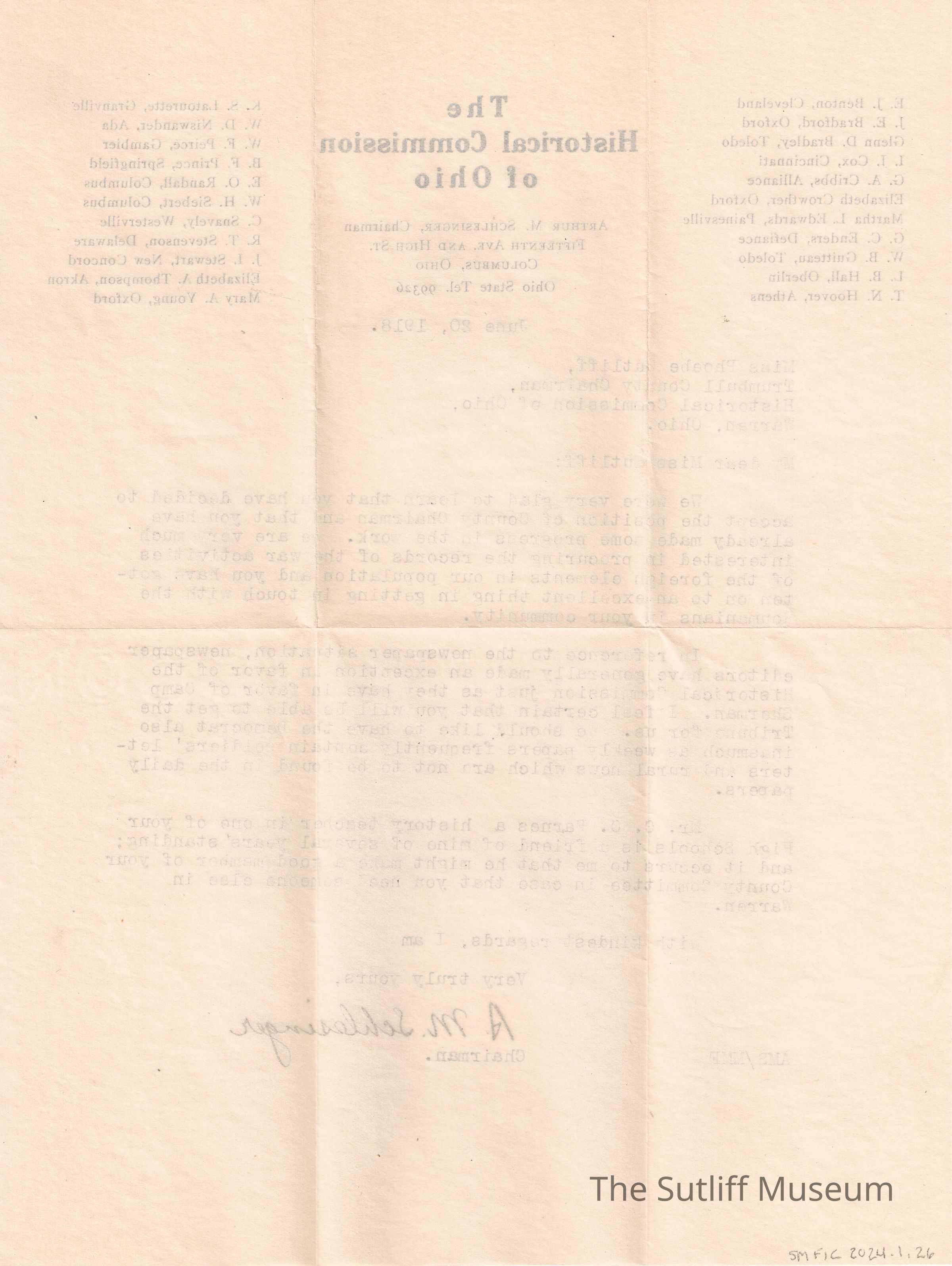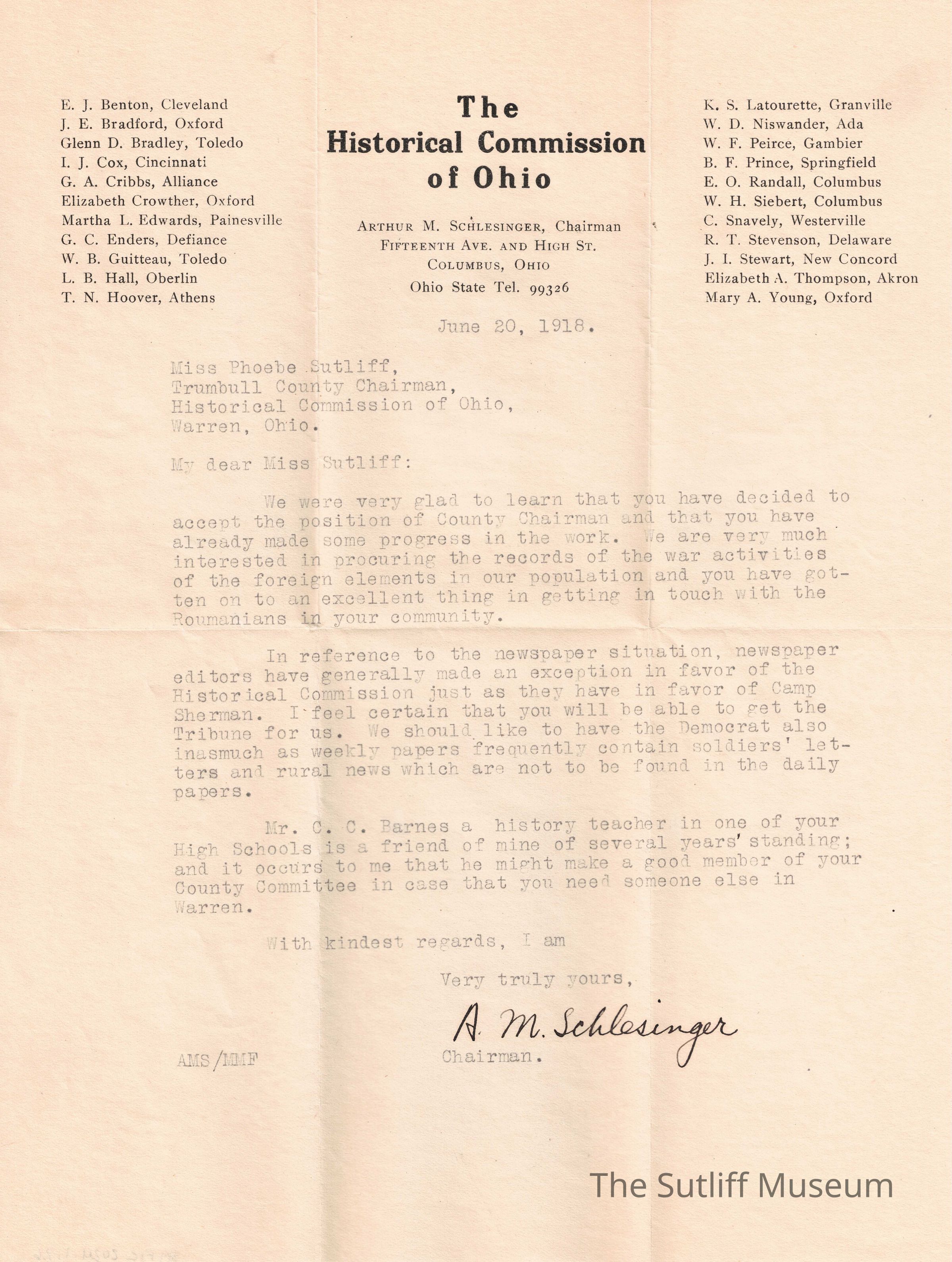 A letter from Arthur M. Schlesinger, the chairman of the Historical Commission of Ohio, to Phebe T Sutliff regarding her acceptance of the position offered to her, as well as their objective to collect newspapers.Relationships