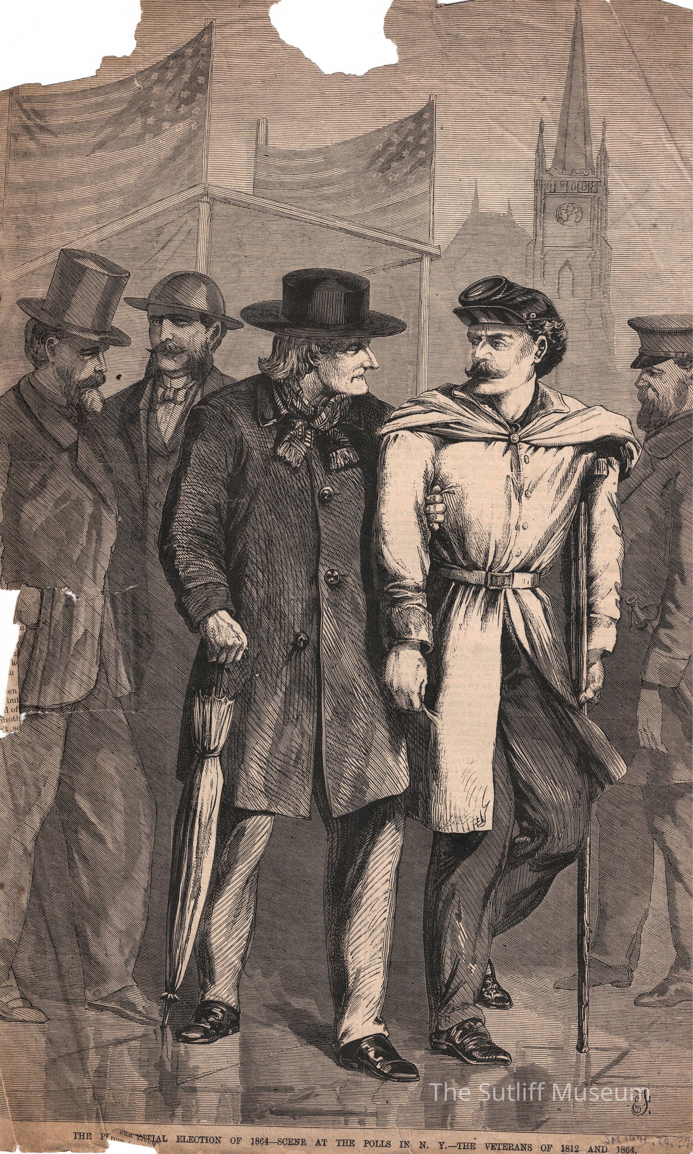 Sketched image titled "The Presidential Election of 1864- Scene at the Polls in N.Y.- The Veterans of 1812 and 1864."Collection