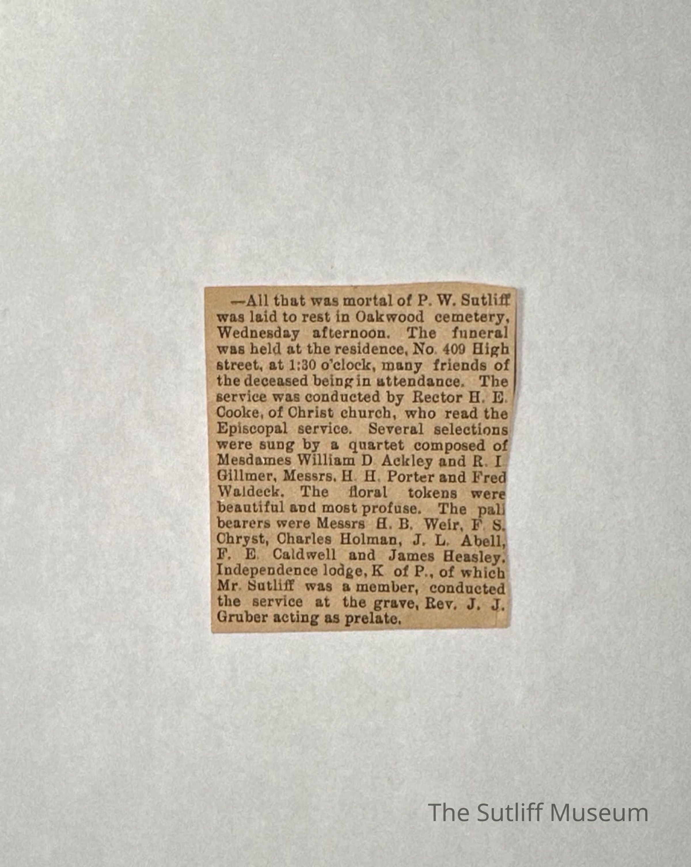 Newspaper clipping with the announcement of Plumb W. Sutliff's death and his funeral.Collection