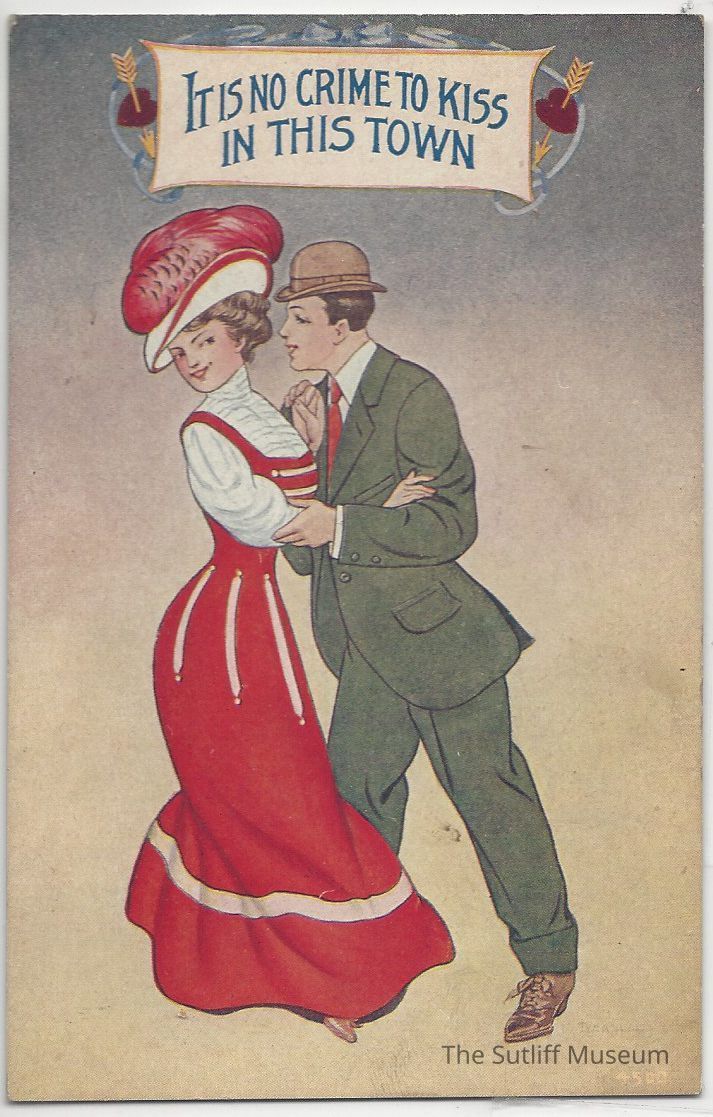 A postcard depicting a man and woman dressed up with the phrase "It Is No Crime to Kiss In This Town" at the top.