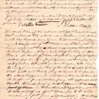 A letter of Joseph Culver and Nathan Webb binding themselves legally to pay Daniel M. Bushnell $100. Following is the conditions they must abide to for the document to remain legal.Relationships