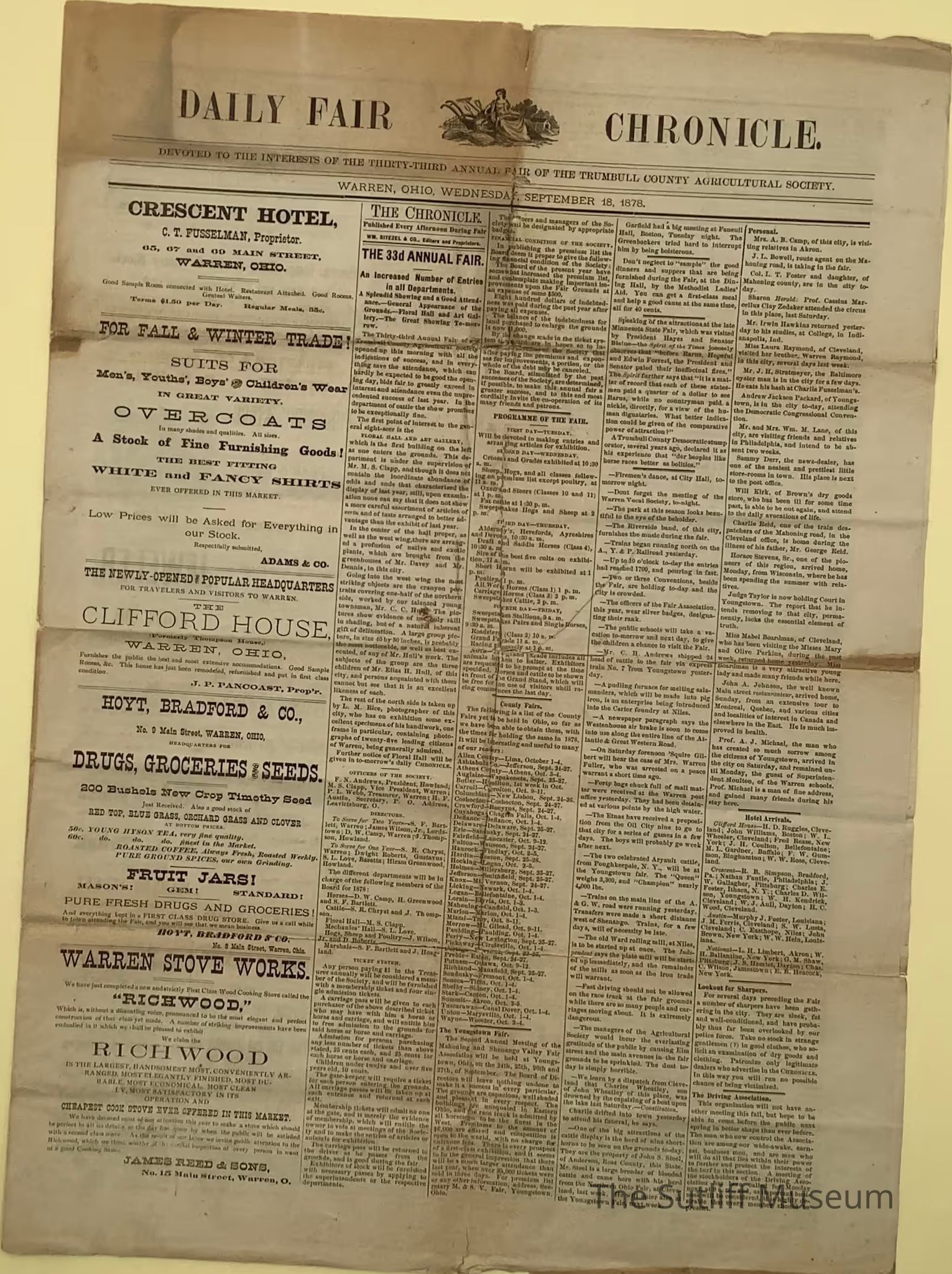 Daily Fair Chronicle newspaper published on September 18, 1878. This edition discusses the 33rd Annual Fair of the Trumbull County Agricultural Society, the 1878 flood and Olive & Mary Perkins.Collection