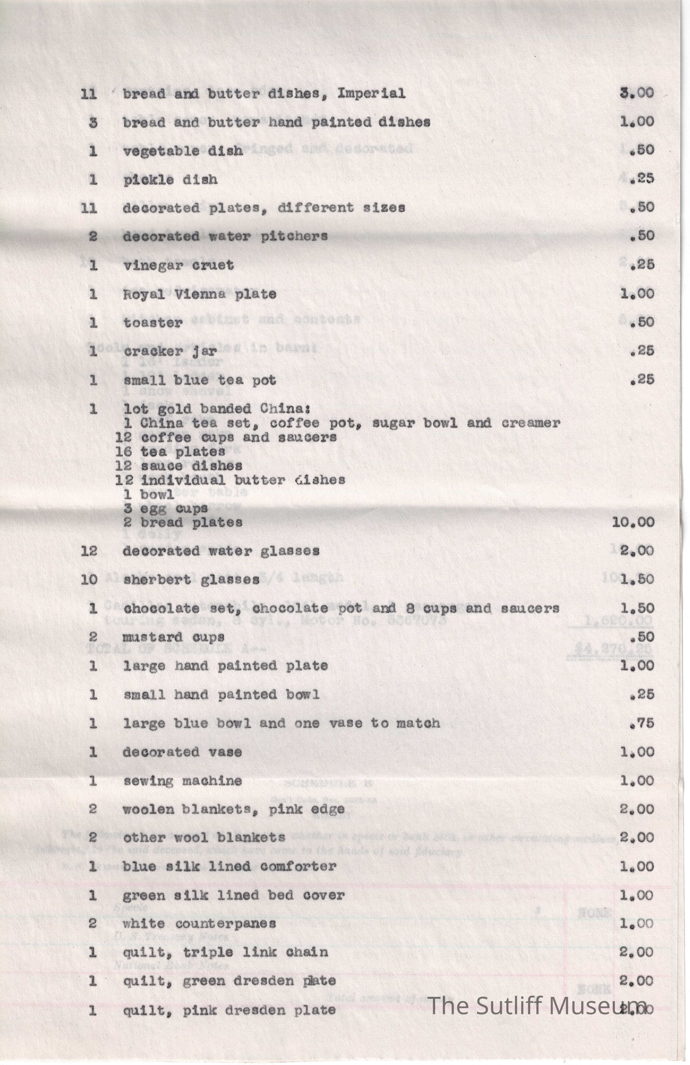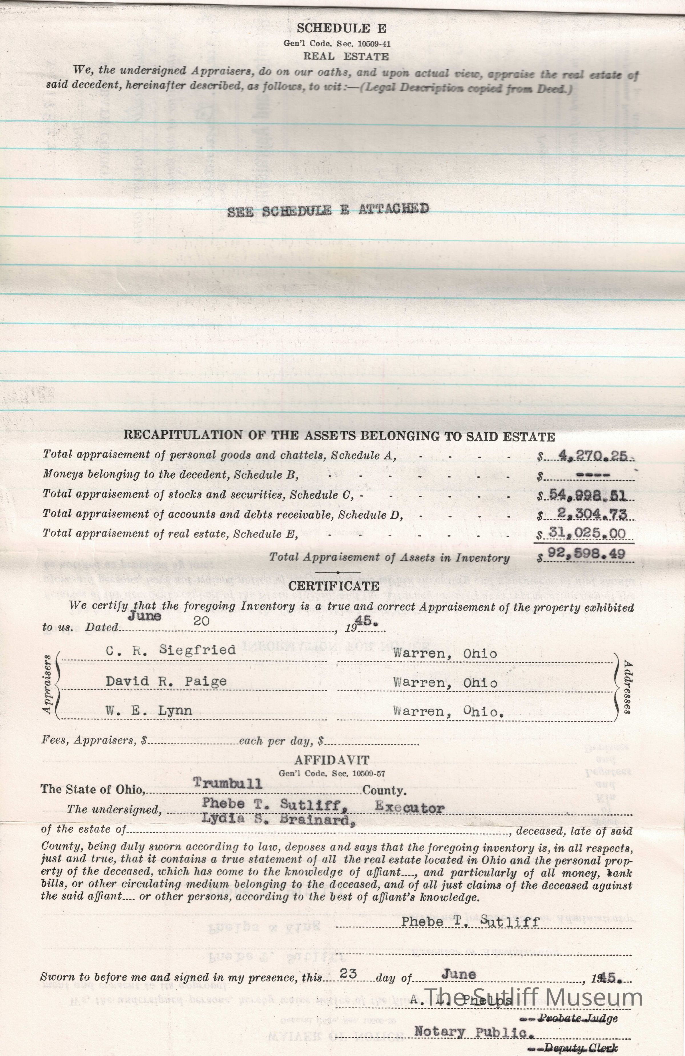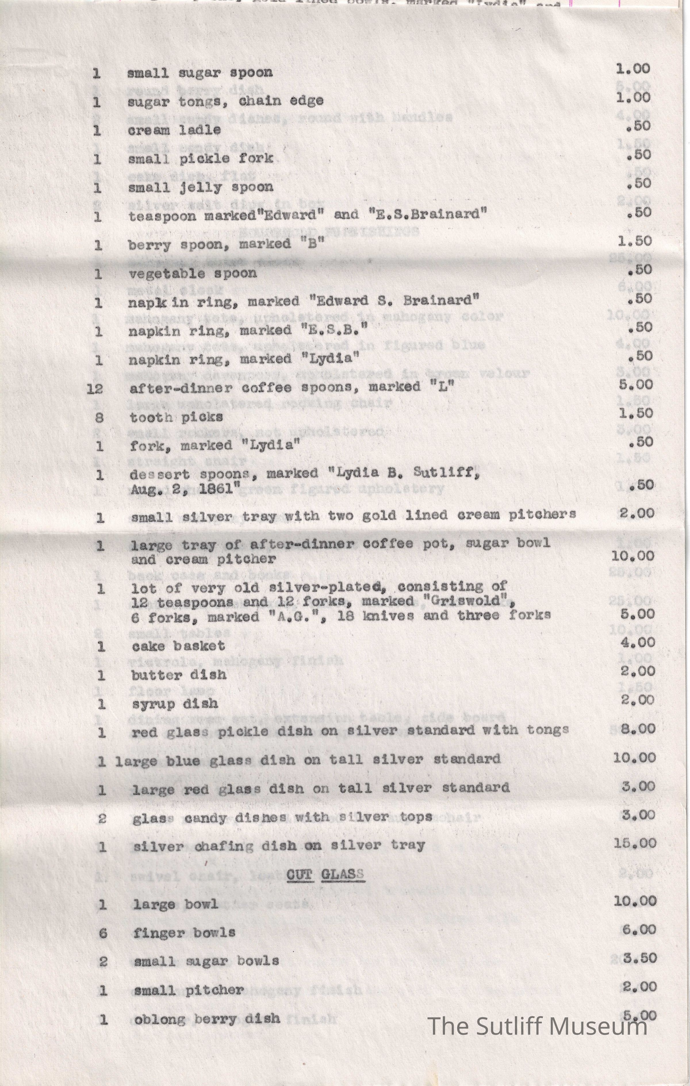 A record of the Estate of Lydia Sutliff Brainard. An inventory and appraisal of her belongings.