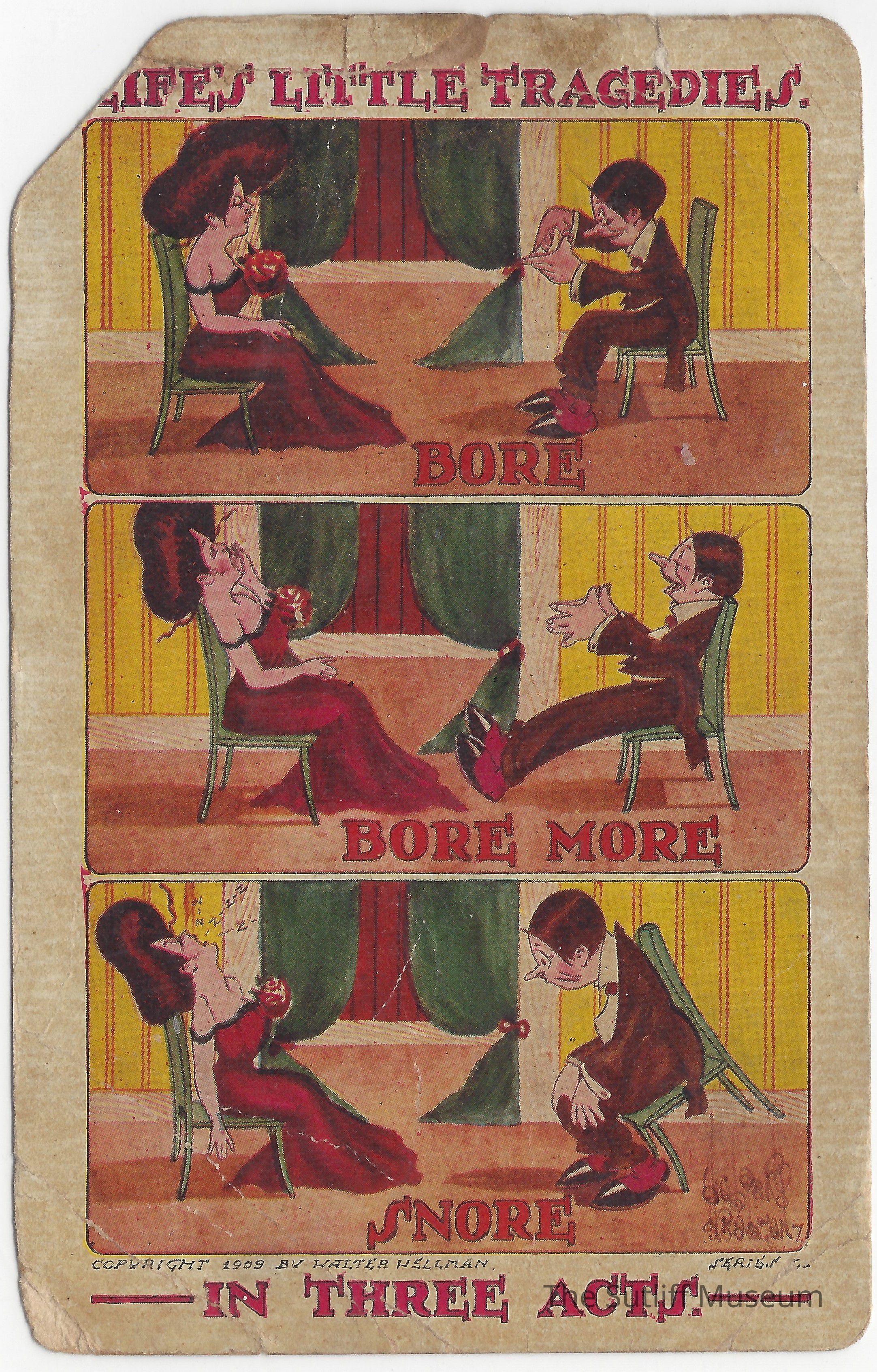 A postcard depicting three acts labelled "Bore", "Bore More", and "Snore" of a woman slowly falling asleep while talking to a man.