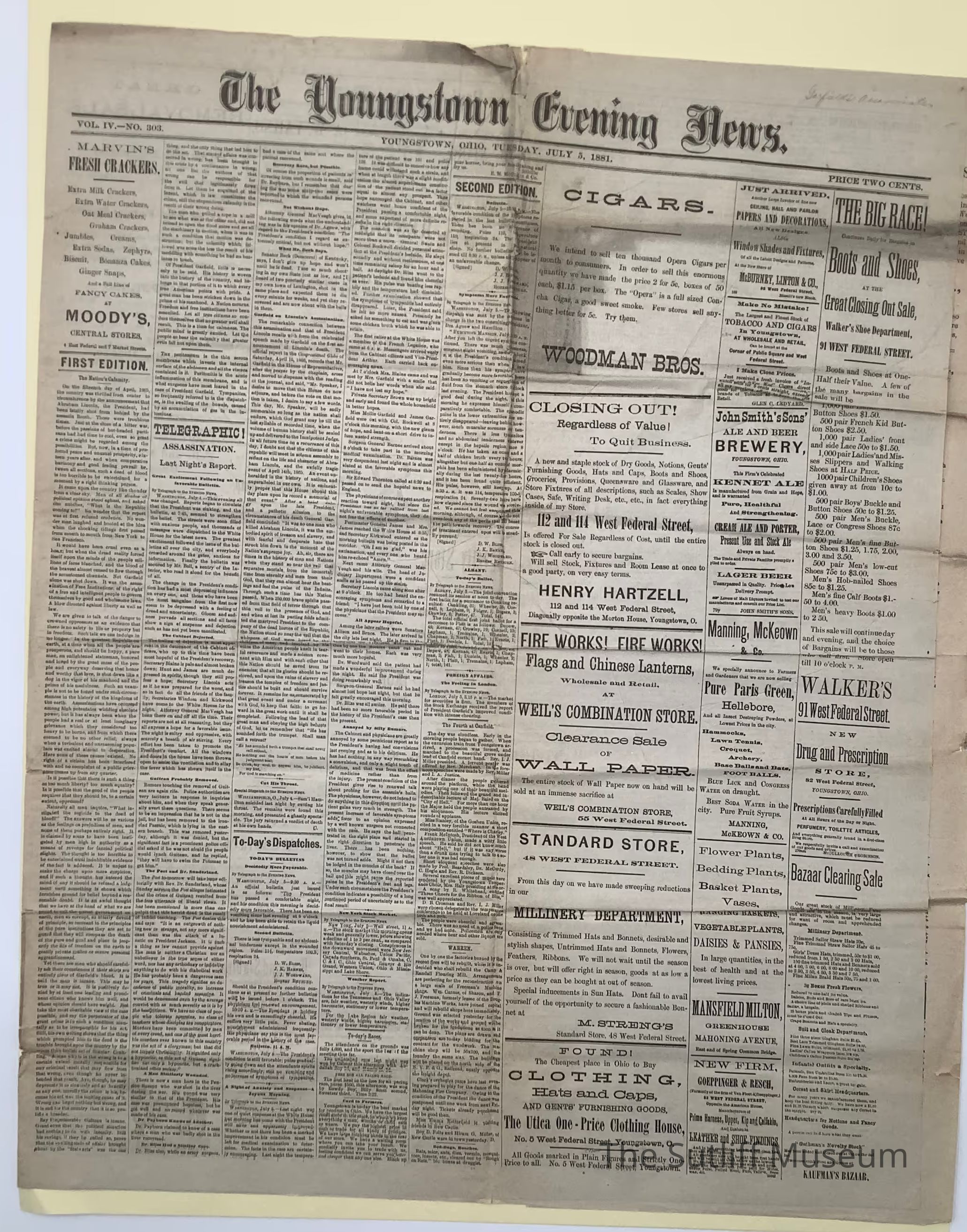 The Youngstown Evening News newspaper published July 5, 1881. This edition discusses President Garfield's health and recalling President Lincoln's assassination.Collection