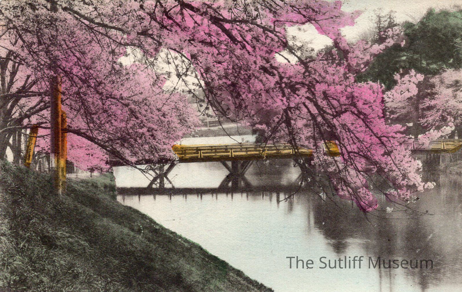 A postcard with color added of a cheery blossom hanging over a body of water and a bridge. The postcard is to Mrs. E.J. Brainard, Lydia Bostwick Sutliff Brainard, at 35 Heights Road, Ridgewood, N.J. from May, undated.Collection