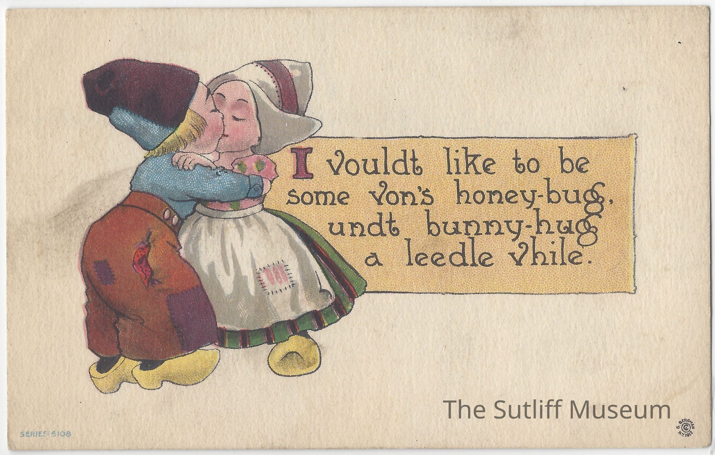 A postcard depicting a boy and girl kissing with the saying "I vouldt like to be, some von's honey-bug, undt bunny-hug a leedle vhile."