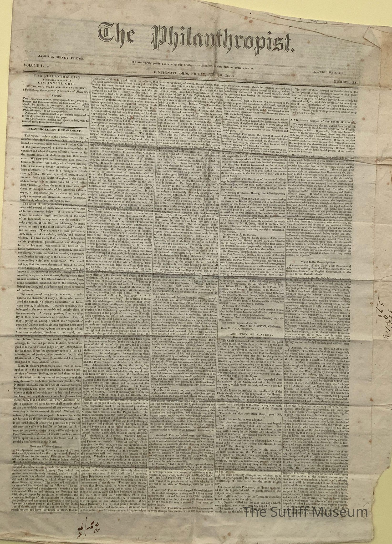 The Philanthropist newspaper, published June 10, 1836.Collection