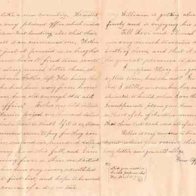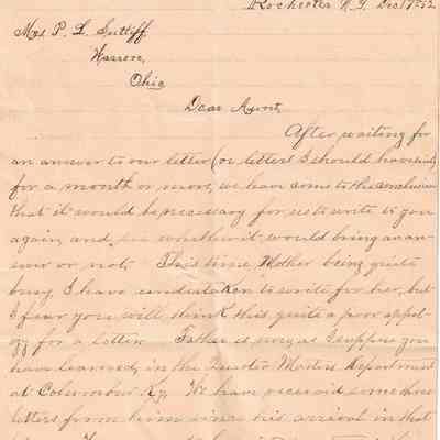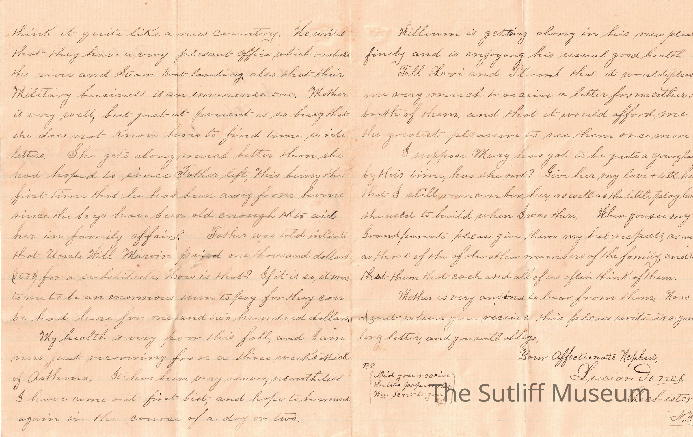 A letter from Lucien Jones to his aunt Phebe Lord Marvin Sutliff regarding not receiving an answer to his previous letters, and updates on his side of the family and his business.Collection