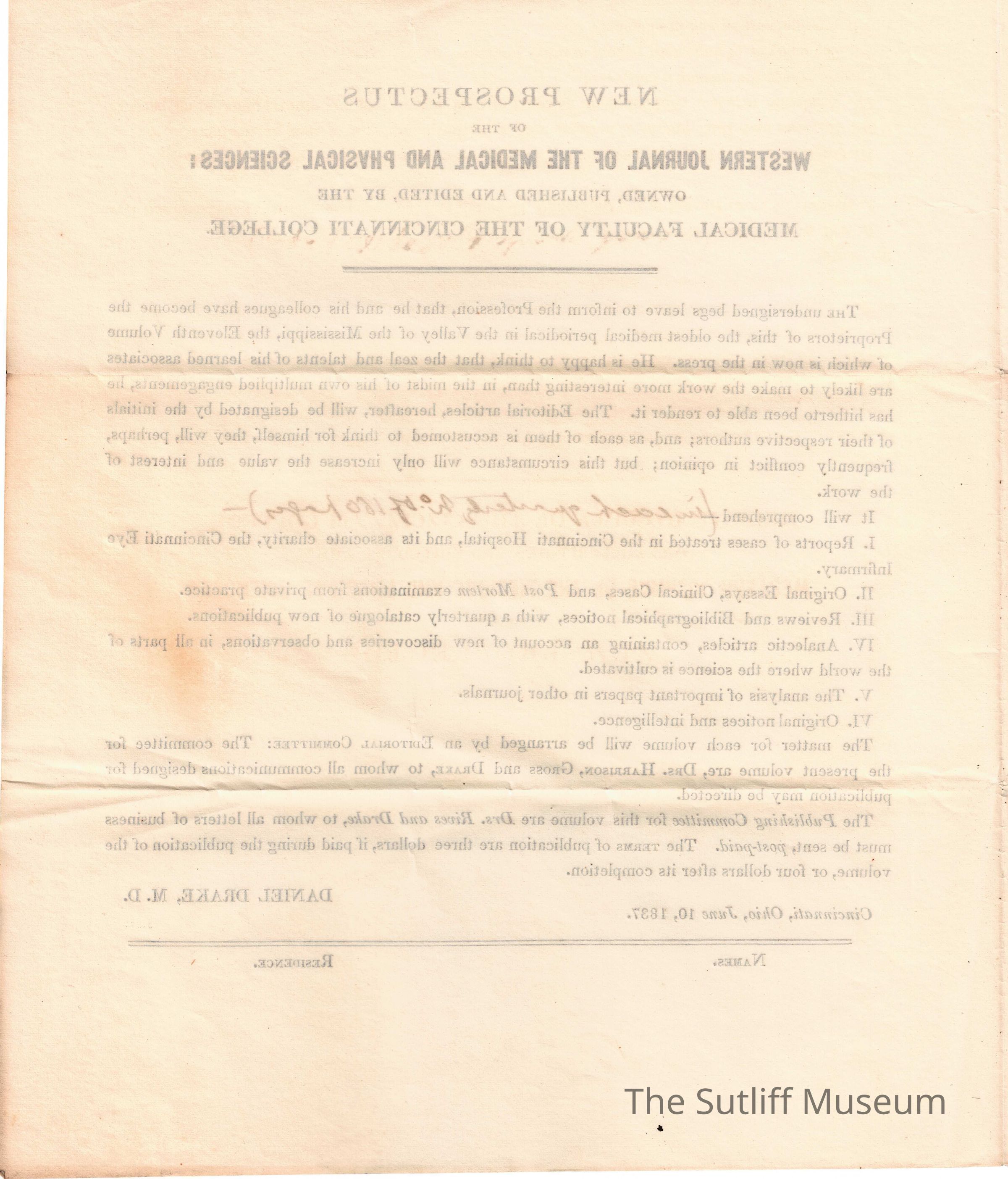 A document titled "New Prospectus of the Western Journal of the Medical and Physical Sciences: Owned, Published and Edited, by the Medical Faculty of the Cincinnati College" that makes it known what they will publish.Relationships