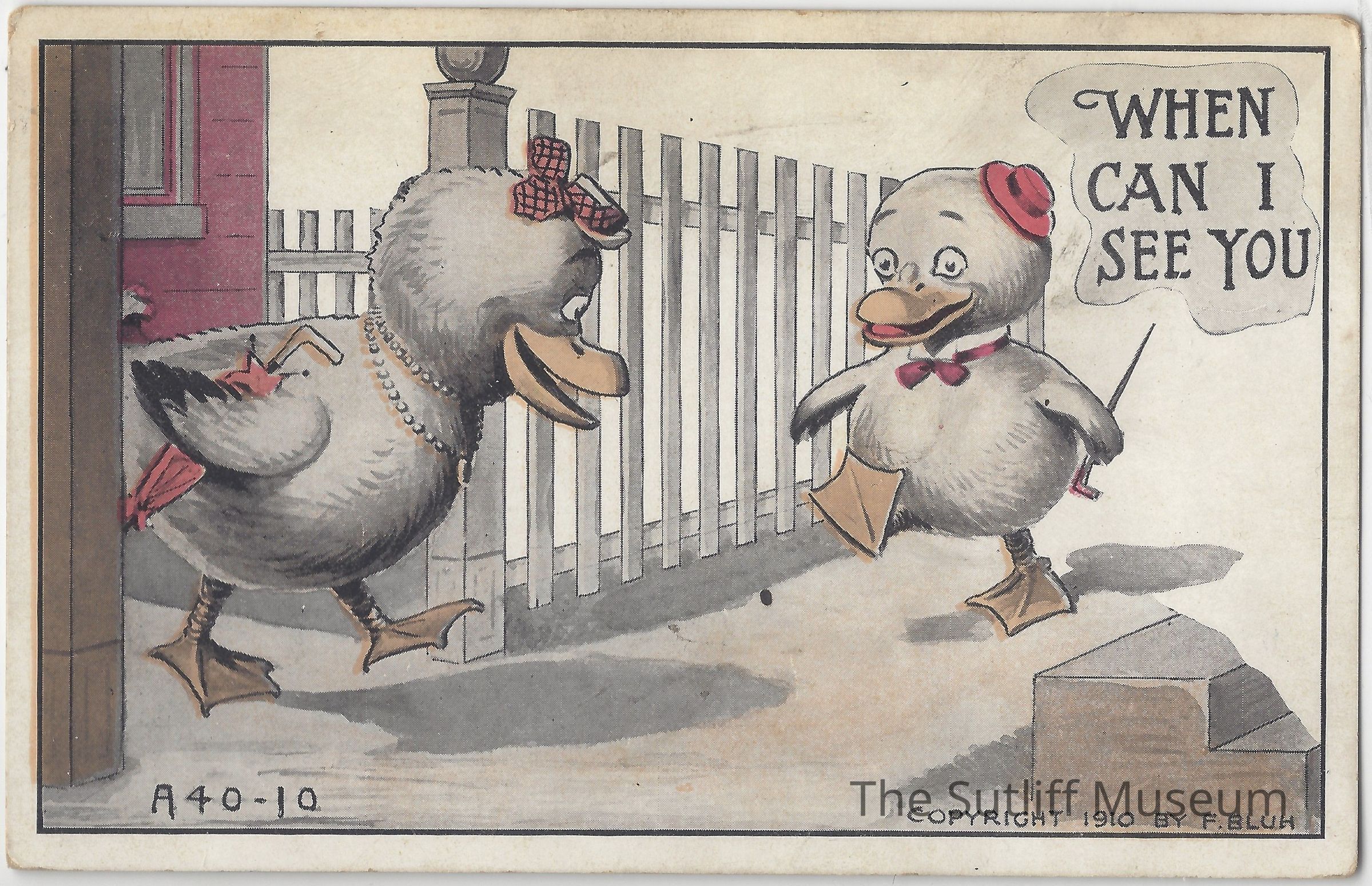 A postcard depicting 2 ducks, one leaving home, the other walking toward her.