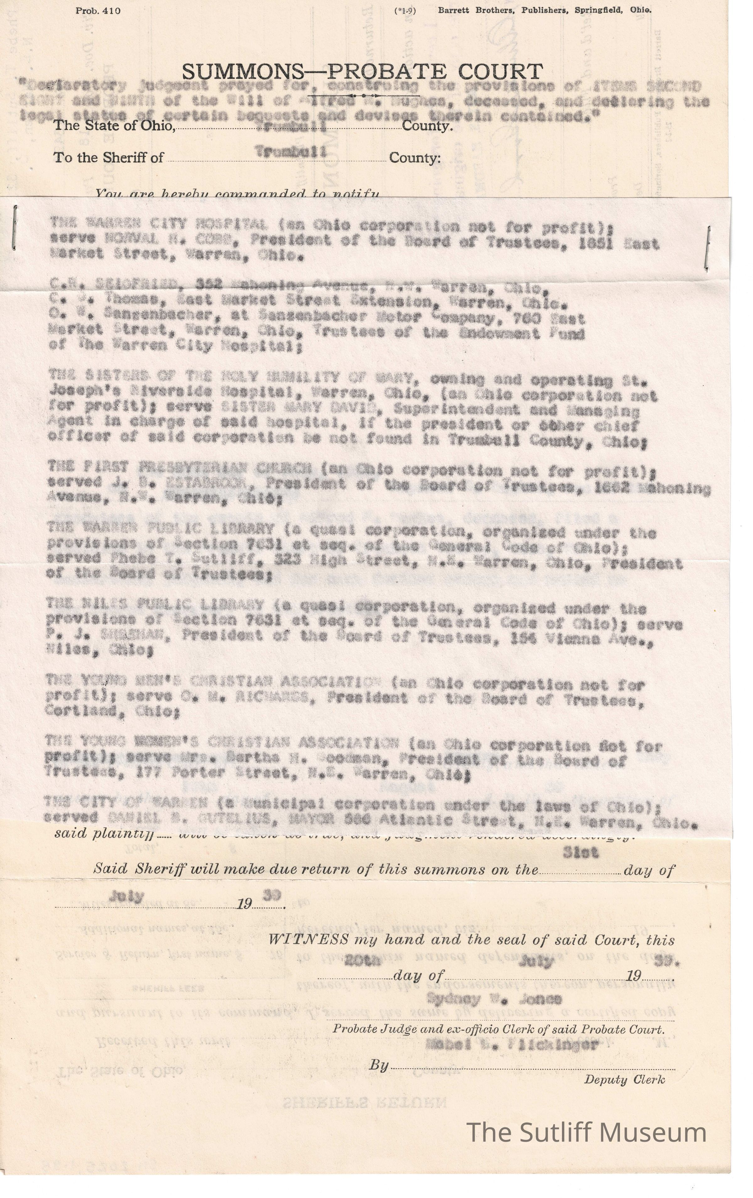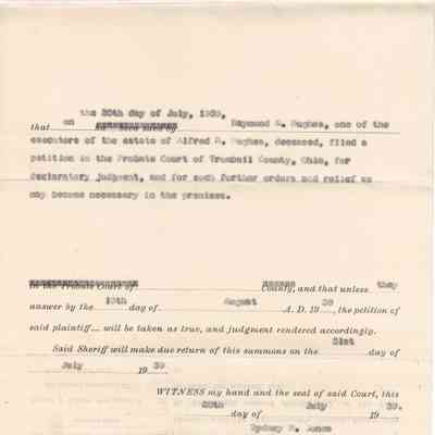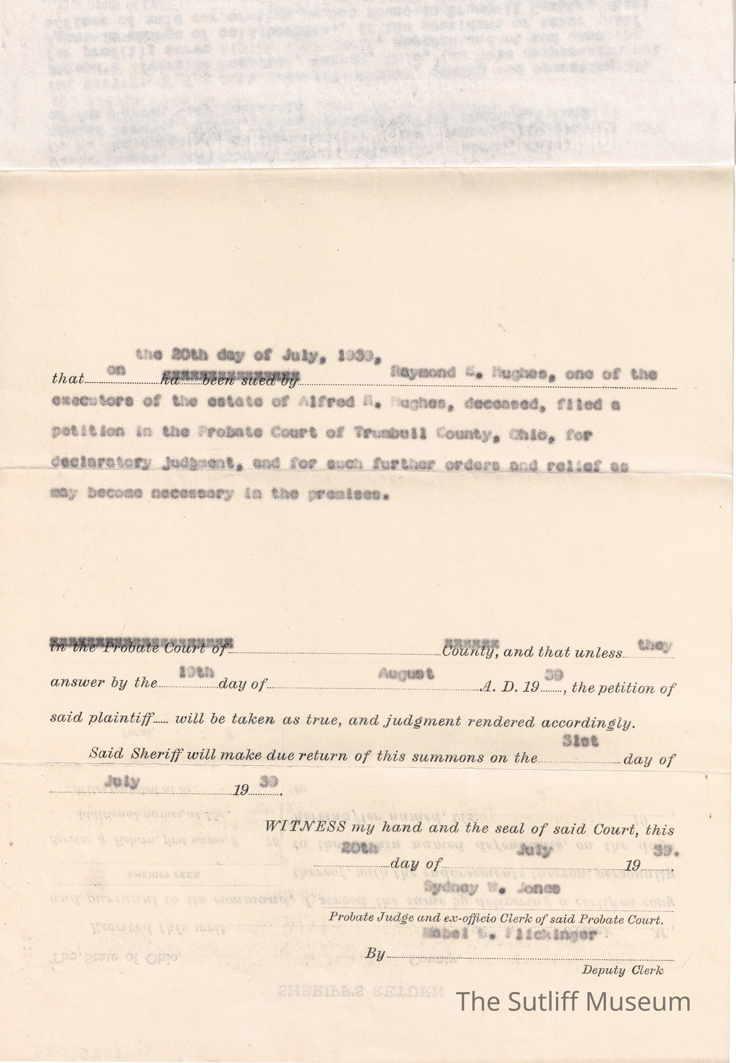 A Summons for Probate Court for Phebe Temperance Sutliff regarding the estate of Alfred R. Hughes.