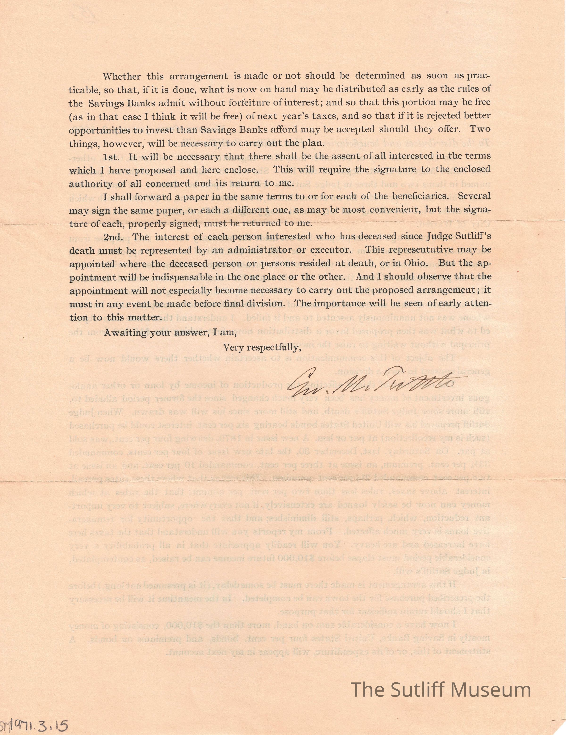 A letter regarding Milton Sutliff's will and how it will be distributed since one of the beneficiaries has passed. It includes the conditions of the arrangement.Collection