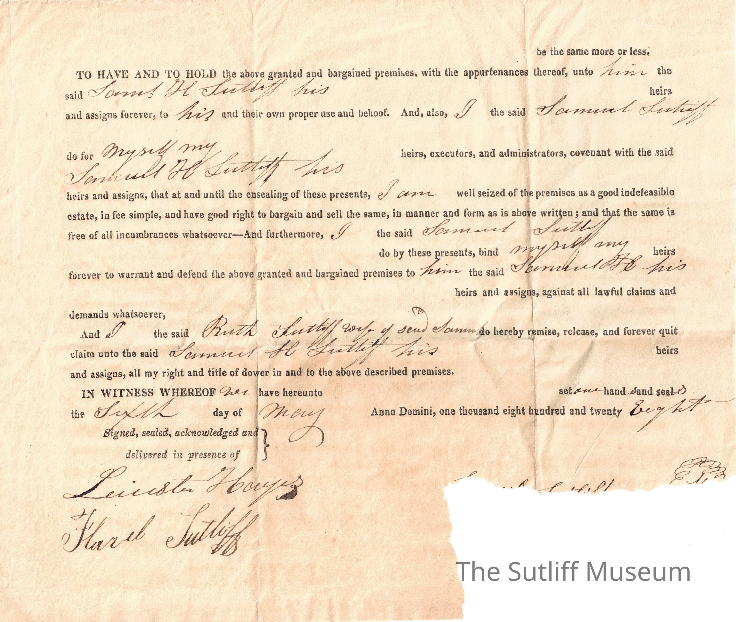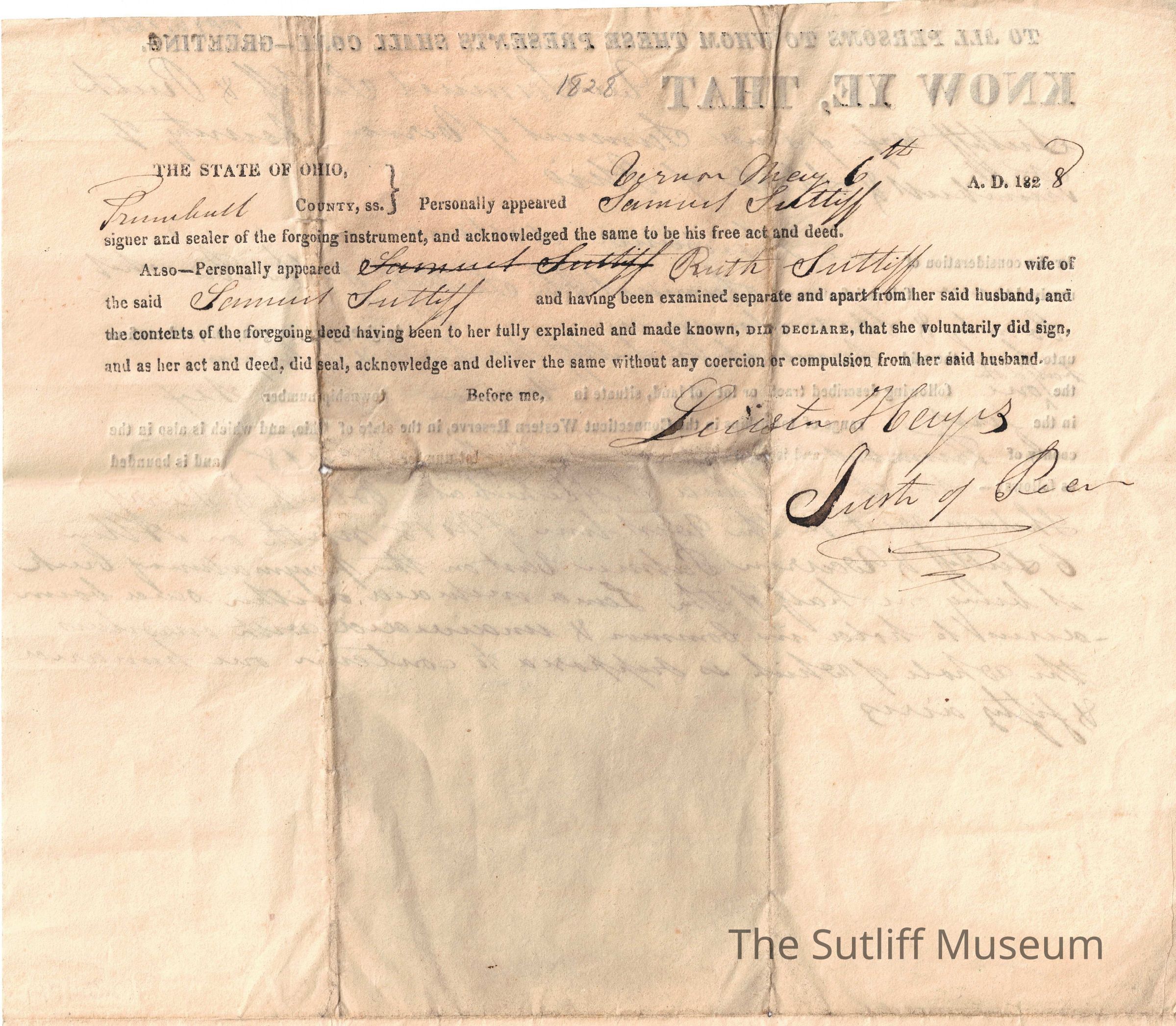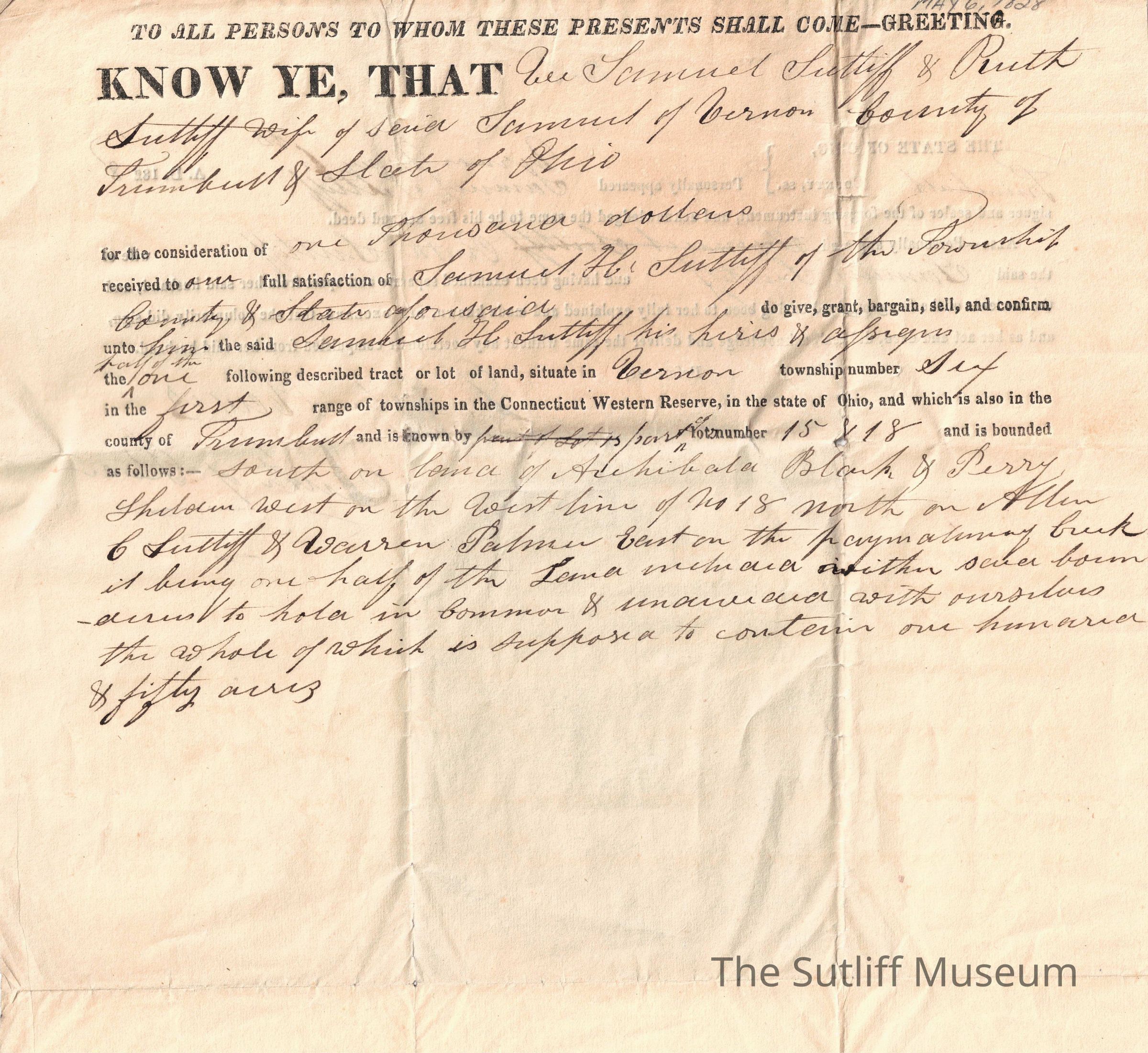 A contract of a transfer of money/dowery from Samuel and Ruth Sutliff to their son Samuel Harvey Sutliff.Collection