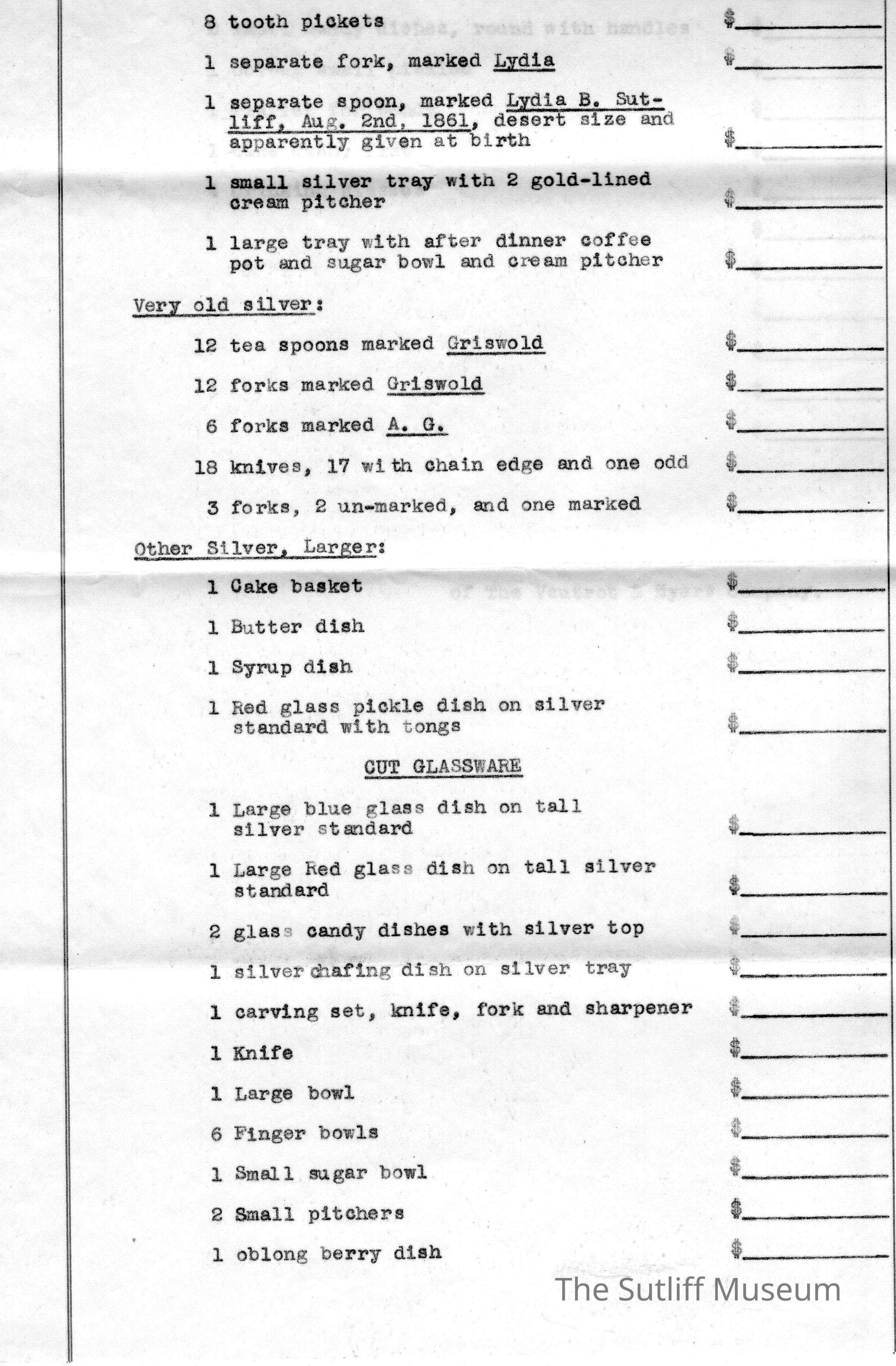 A record of the Estate of Lydia Sutliff Brainard. A record of all her valuable jewelry, silverware, and other articles.Collection