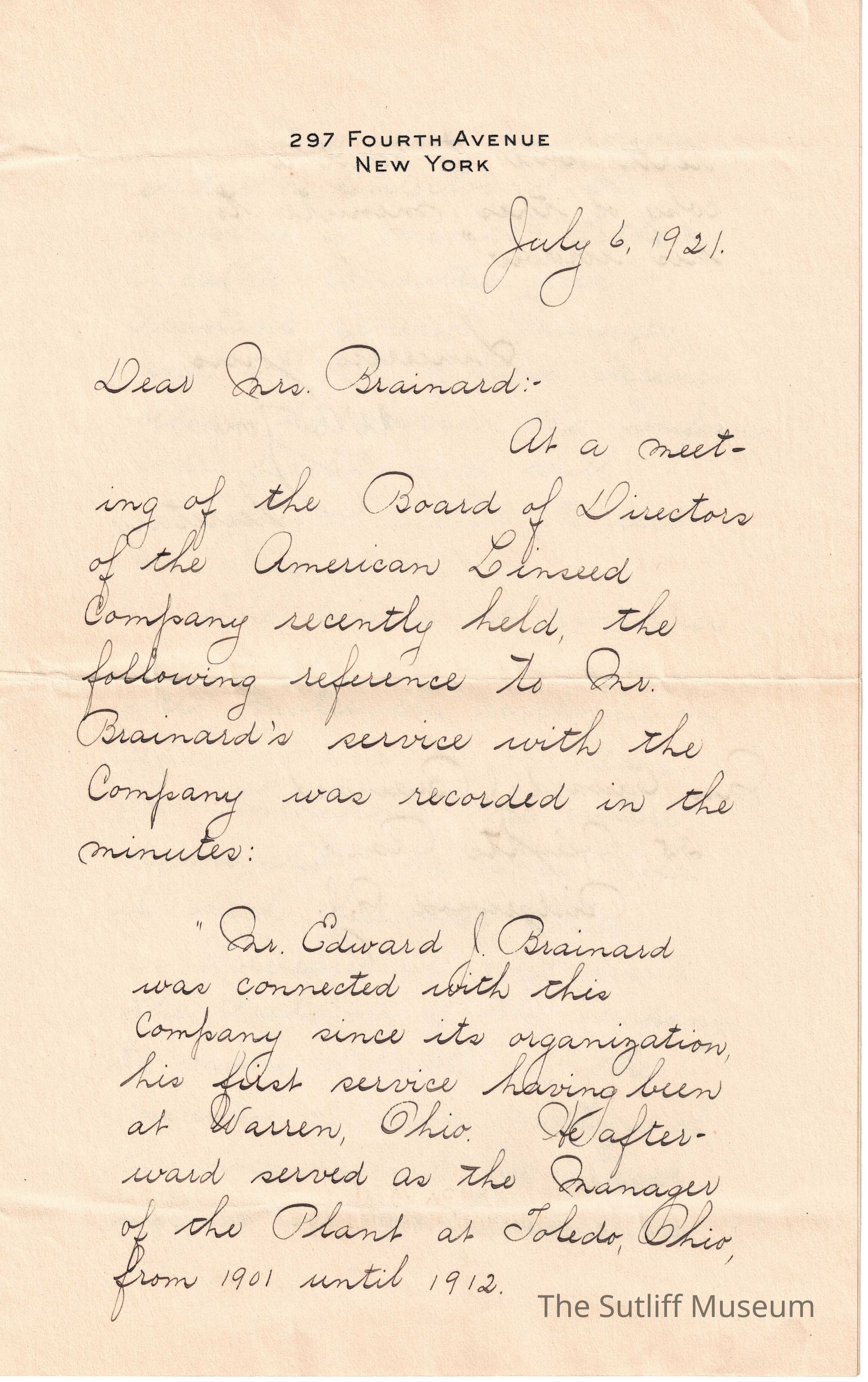 A letter from W.A. Jones to "Mrs. Edward J. Brainard" or Lydia Sutliff Brainard regarding a meeting at his former company, the American Linseed Company, where his service was referenced.