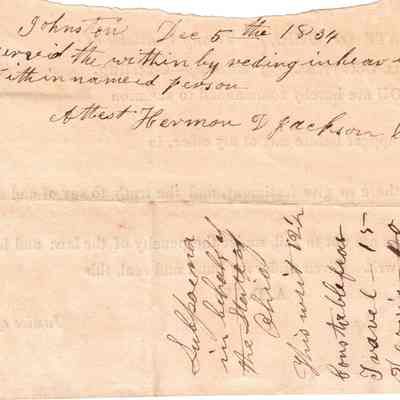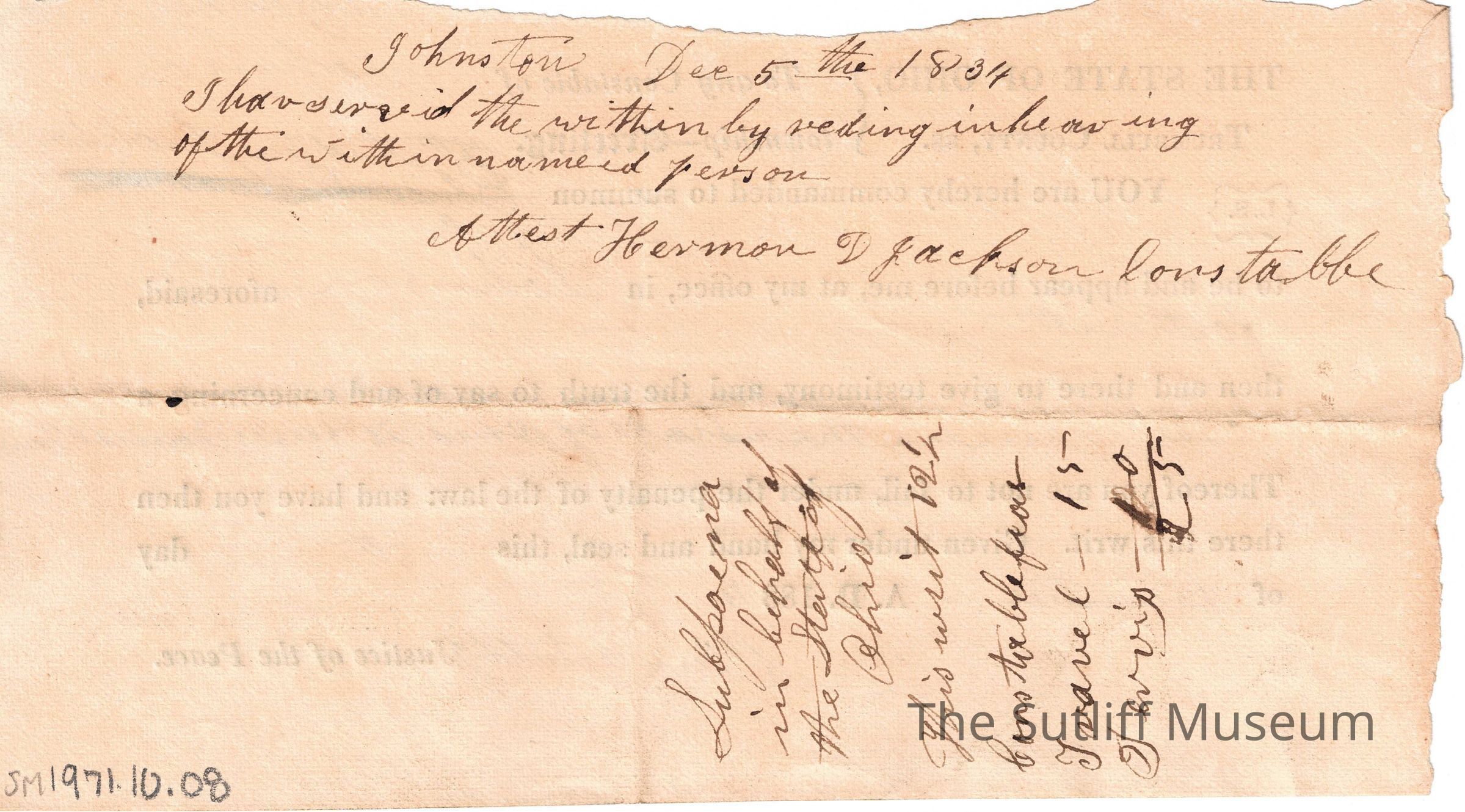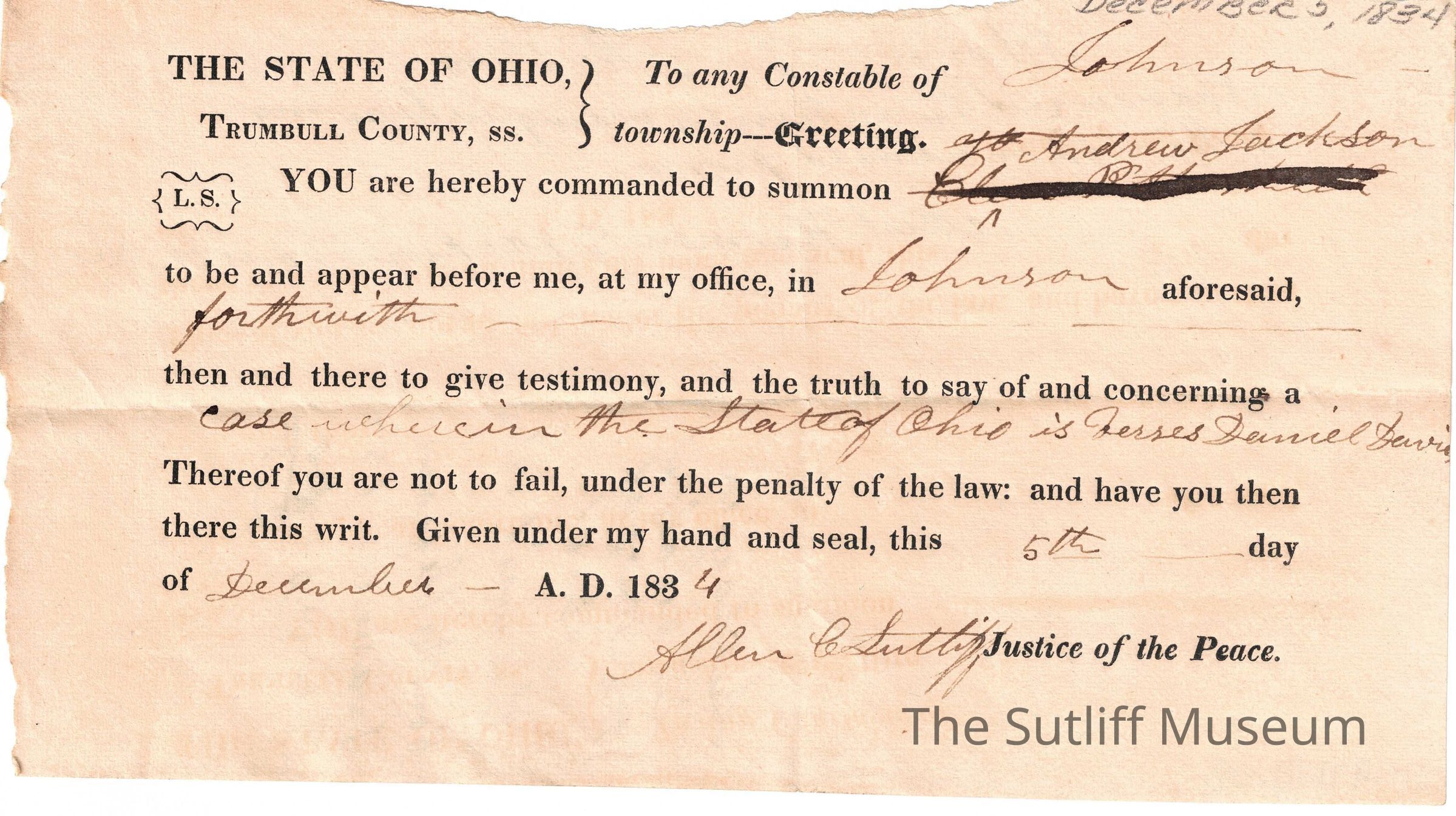 A notice of summons from Allen C. Sutliff for Andrew Jackson to give testimony for a legal case.Relationships