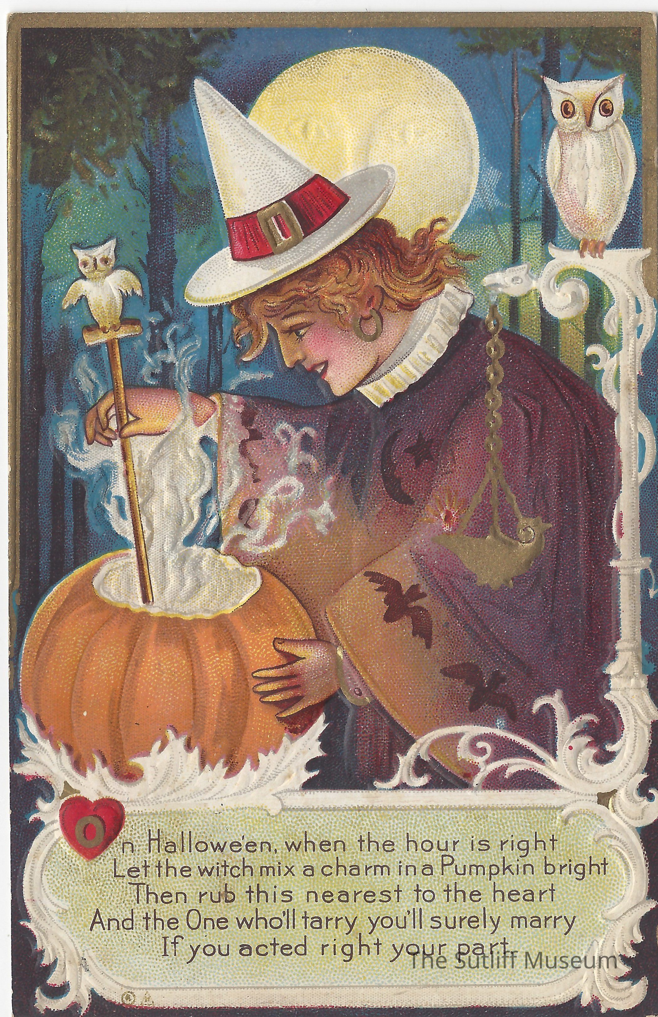 Halloween postcard depicting a witch with an own staff stirring a potion in a pumpkin at night.