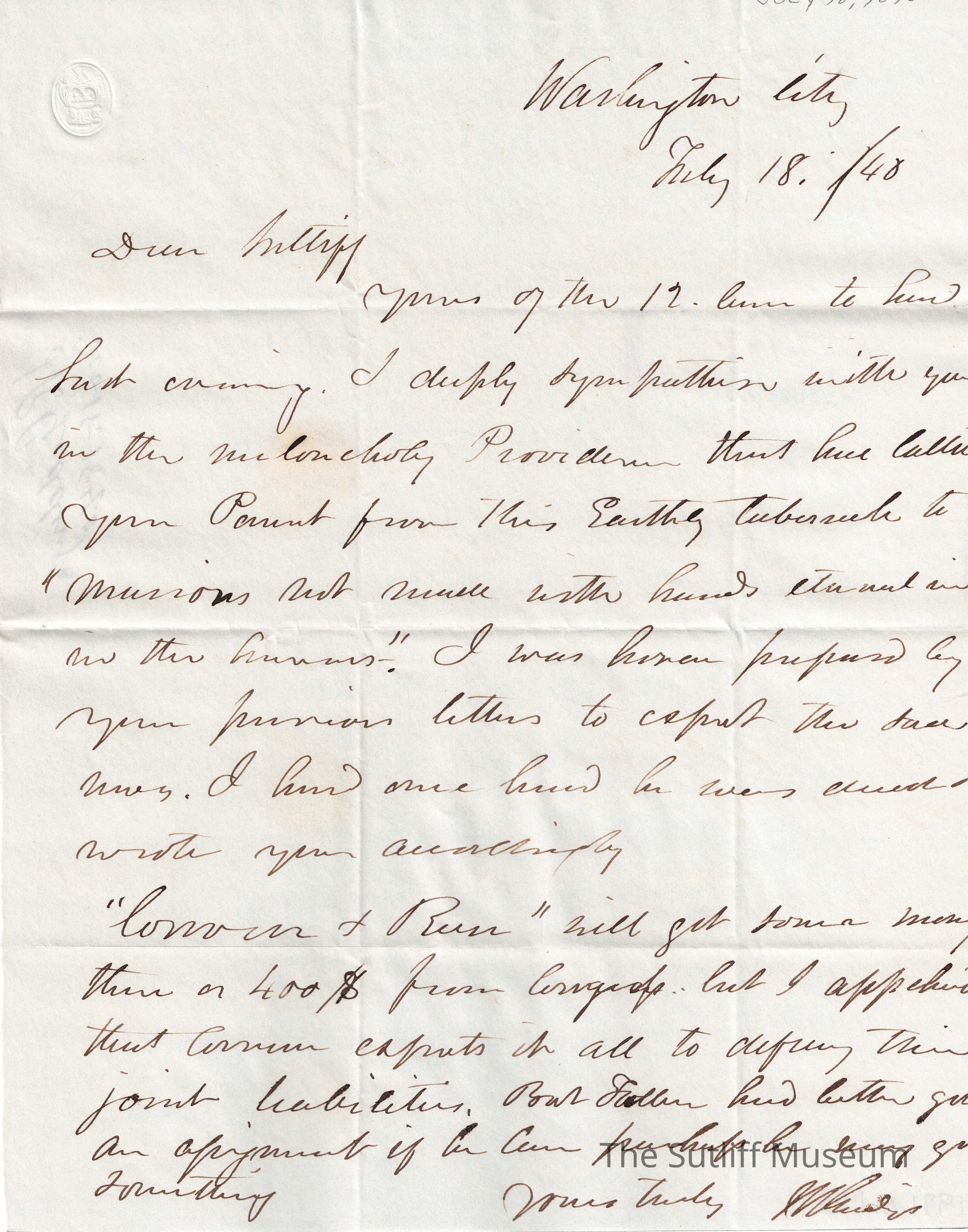 Letter from Joshua Reed Giddings to Flavel Sutliff regarding more condolences and advice on the death of Flavel's father,