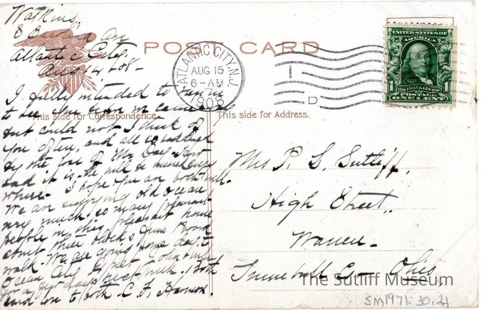 Postcard to P.L. Sutliff from C.F. [?]Entry/Object ID