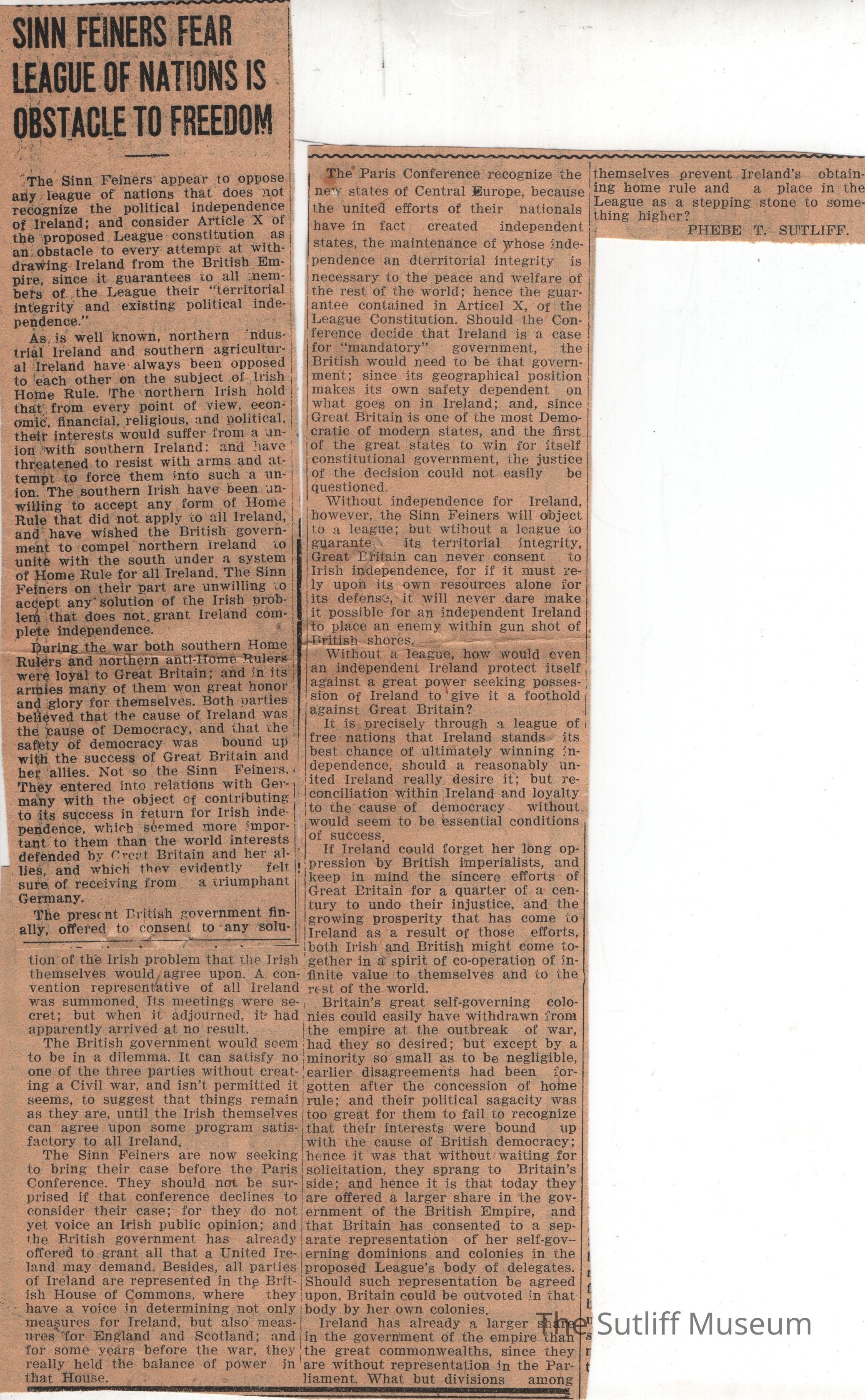 An article titled "Sinn Feiners Fear League of Nations is Obstacle to Freedom" by Phebe T. Sutliff.Collection