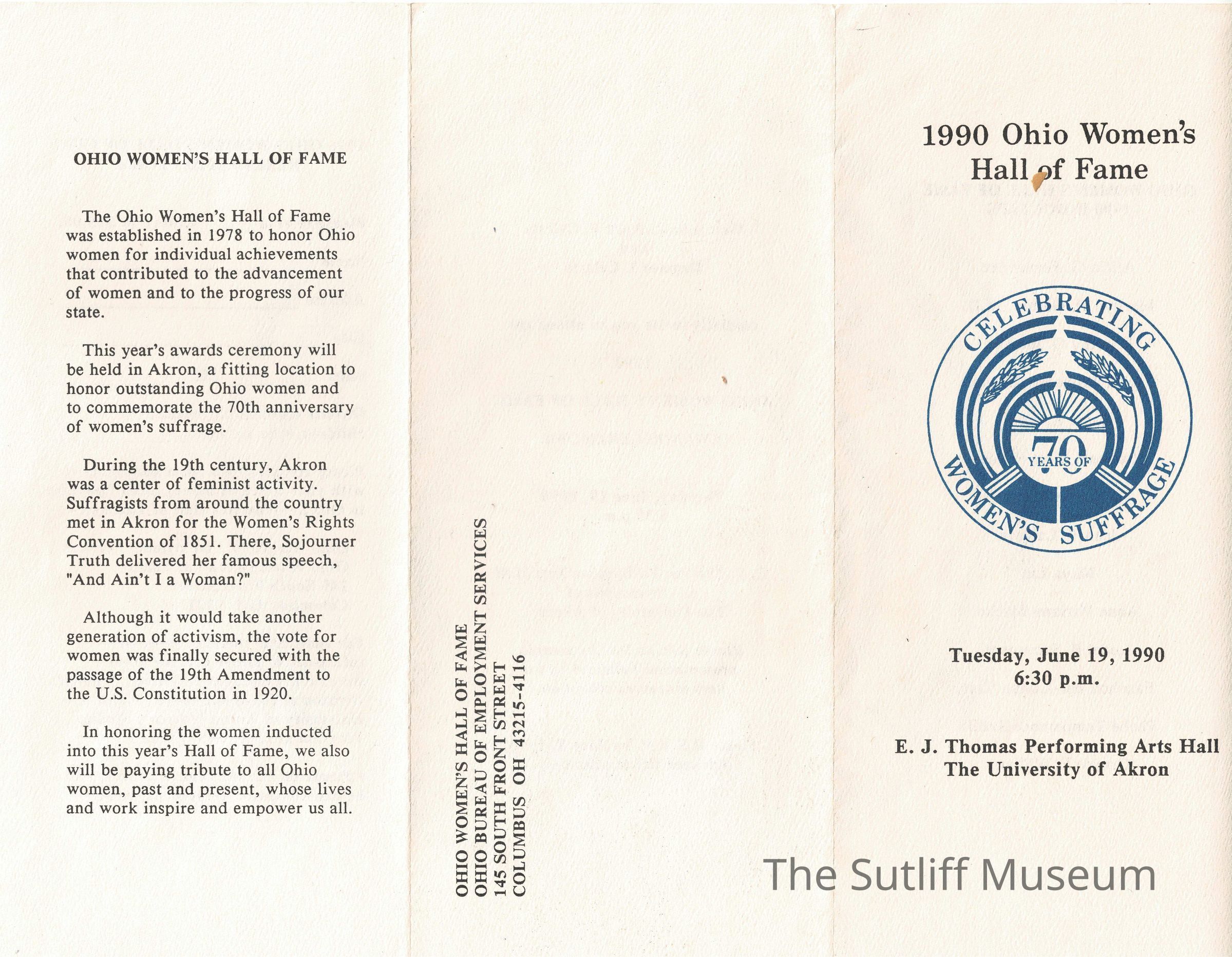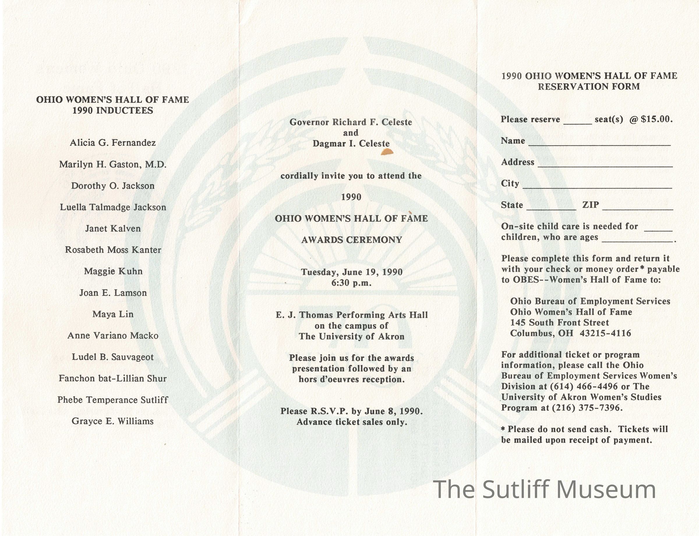 One page tri-fold announcement of Hall of Fame induction ceremony on June 19, 1990 of Phebe Sutliff with reservation form intact.Collection
