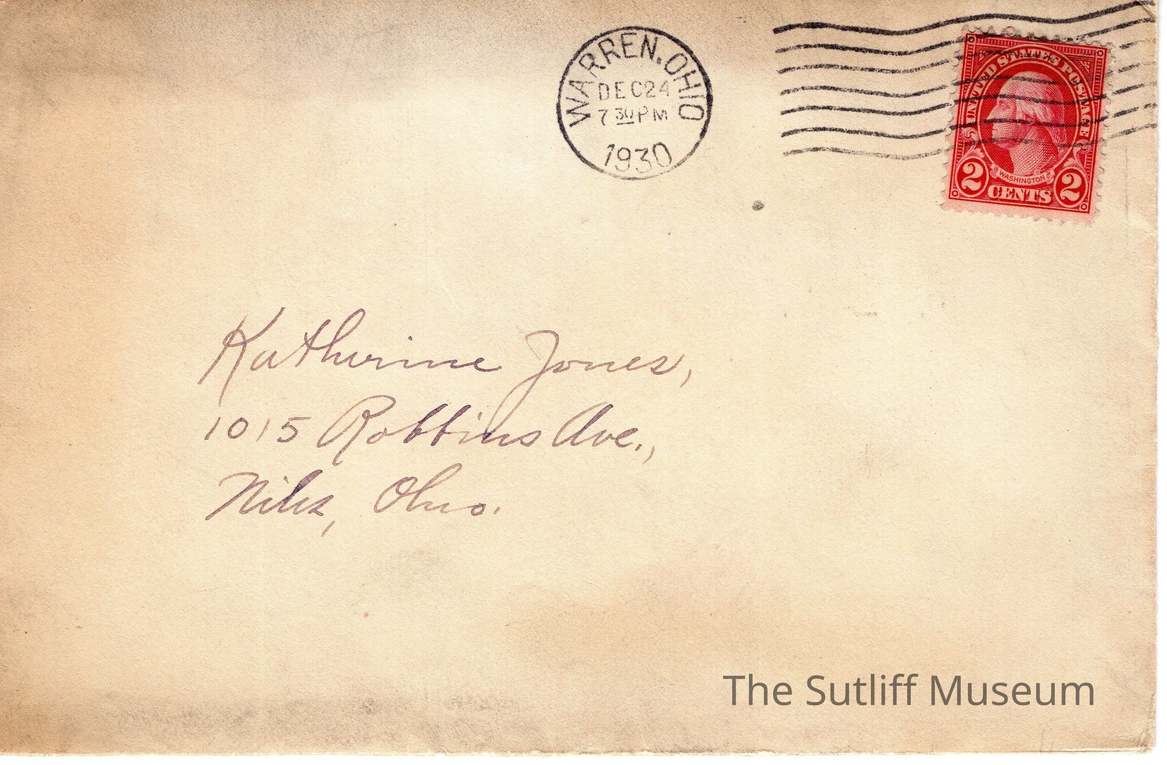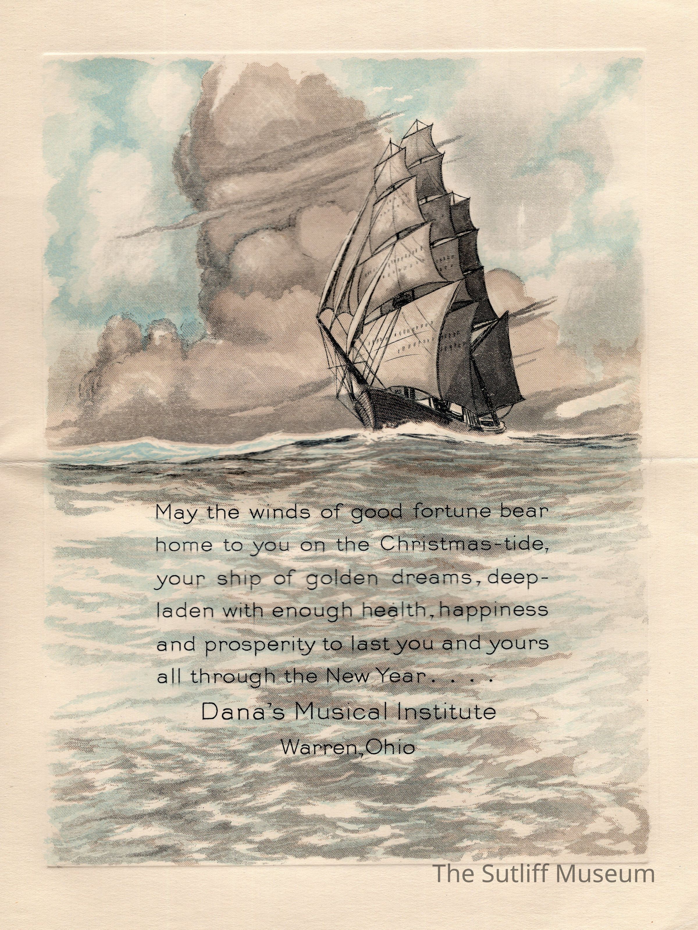 Single sheet quarter fold Christmas greeting card from Dana's Musical Institute, Warren, Ohio. Scene on inside shows sailing ship on sea with billowing clouds behind and the text, "May the winds of good furtune bear home to you on the Chrismas-tide, your ship of golden dreams, ddep-laden with enough health, happiness and prosperity to last you and yours all through the New Year...Dana's Musical Institute Warren, Ohio." Card is inside original mailing envelope which is addressed in handwritten pen to Katherine Jones, 1015 Robbins Ave. Niles, Ohio. Postmark is dated Dec 24 1930 7:30 PM from Warren, Ohio, and bears a 2 cent stamp.Collection