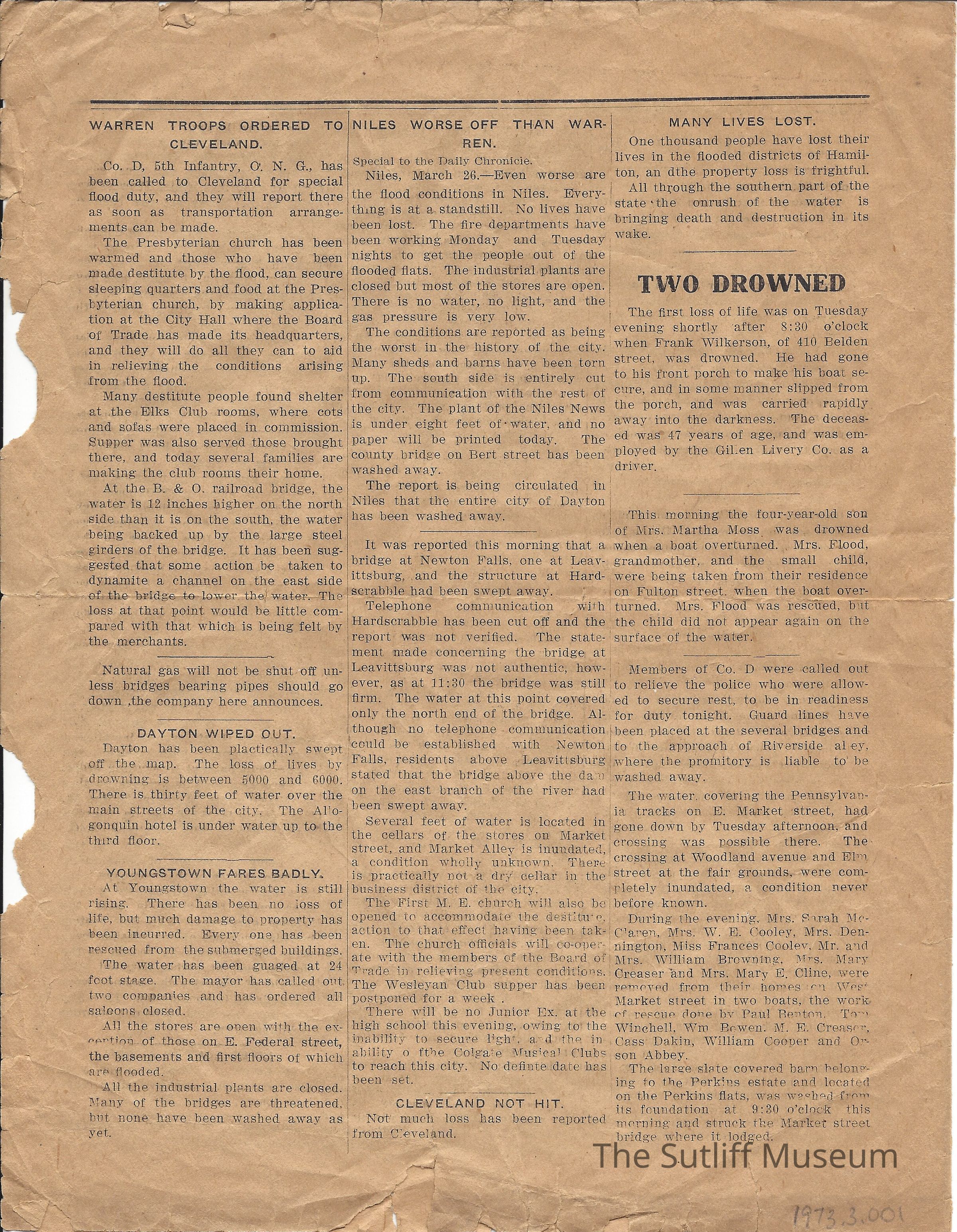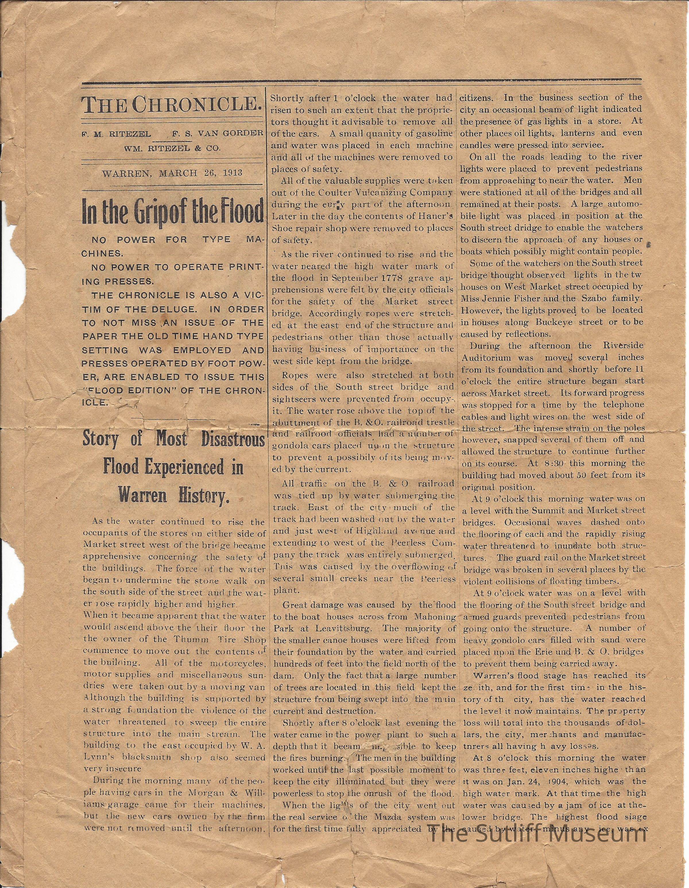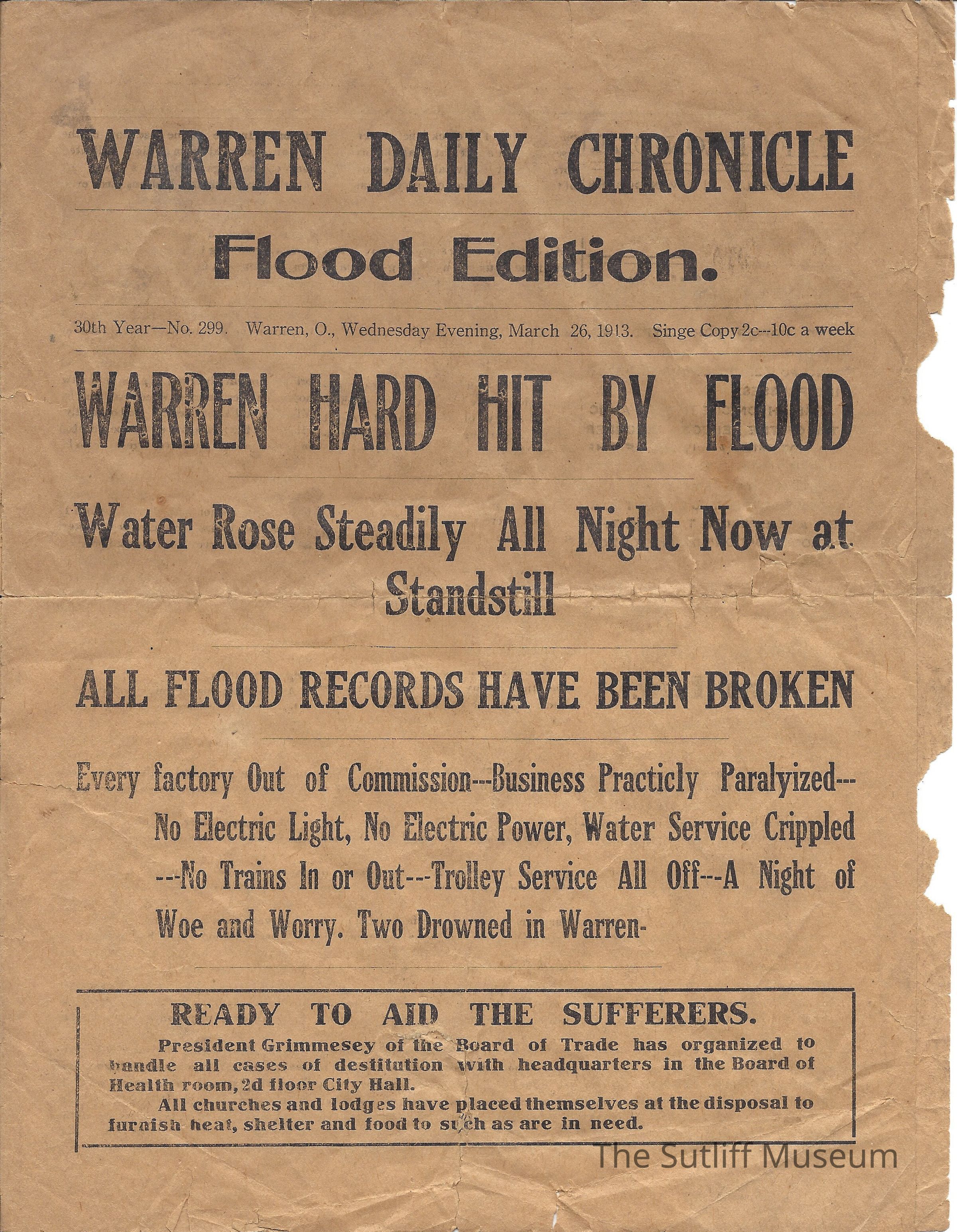 Newspaper clipping-Warren Daily Chronicle Flood Edition dated March 26, 1913. One folded page in plastic sleeve.