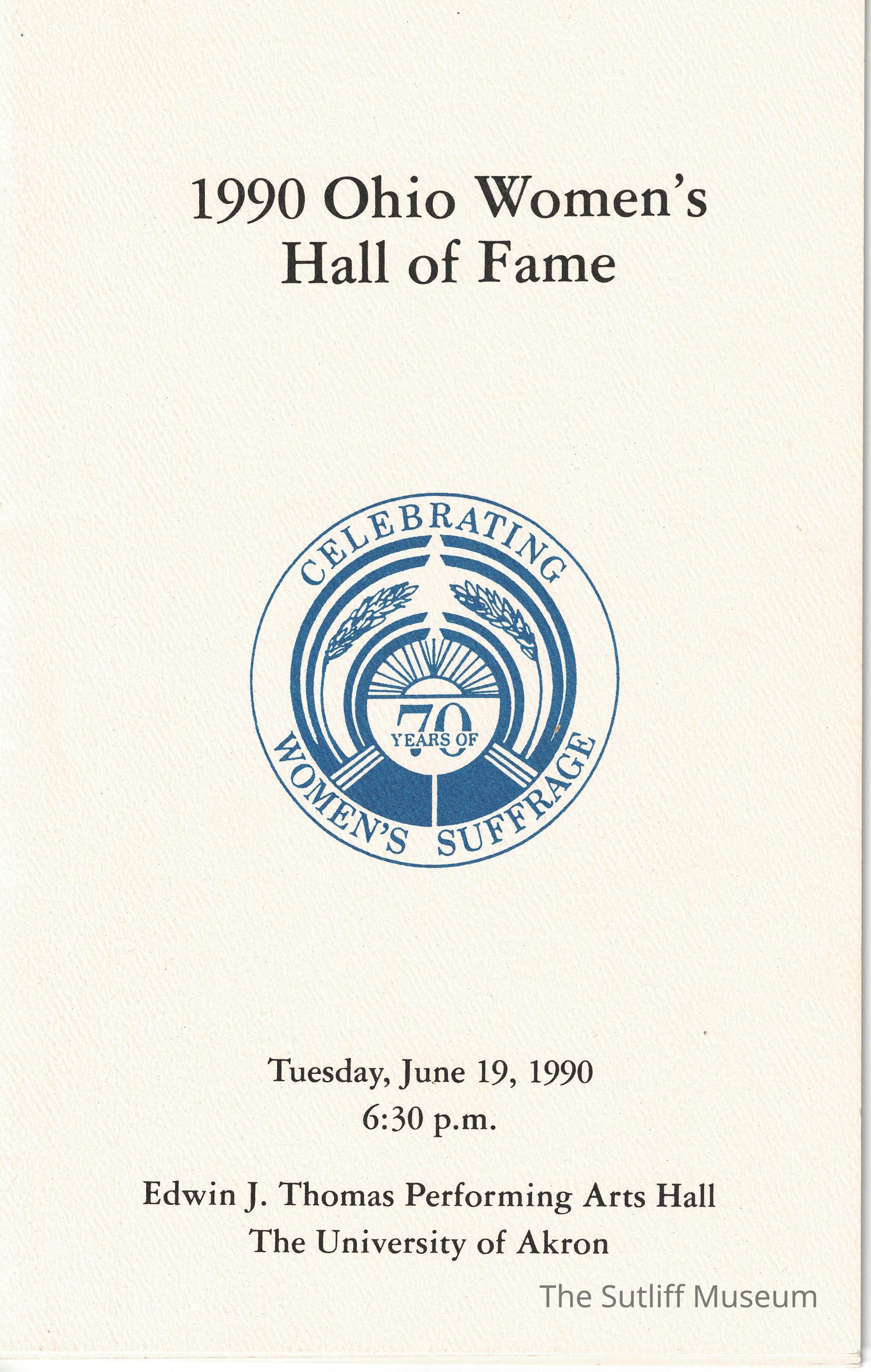 Program from the June 19, 1990 Ohio Women's Hall of Fame ceremony in which Phebe Temperance Sutliff was inducted. On the cream colored front cover is "1990 Ohio Women's Hall of Fame" in black print. Underneath is the circular seal with sunrise and the inscription CELEBRATING 70 YEARS OF WOMEN'S SUFFERAGE in blue. Under that "Tuesday, June 19, 1990 6:30 p.m. Edwin J. Thomas Performing Arts hall The University of Akron." Eight pages describe the 1990 inductees and the Hall of Fame.Collection