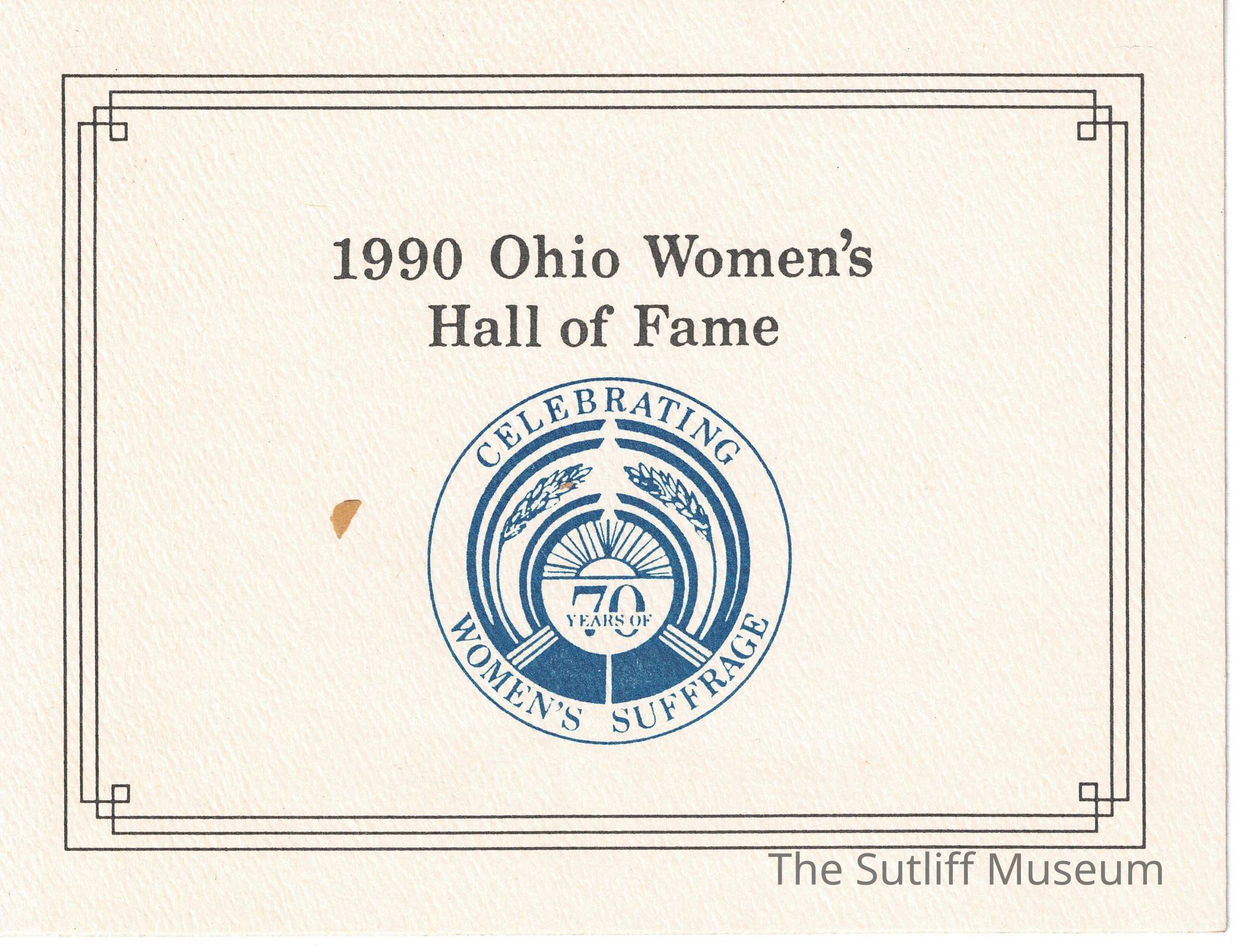 Single fold invitation to the 1990 Ohio Women's Hall of Fame ceremony. White with black border and print and blue seal celebrating women's sifferage.Collection
