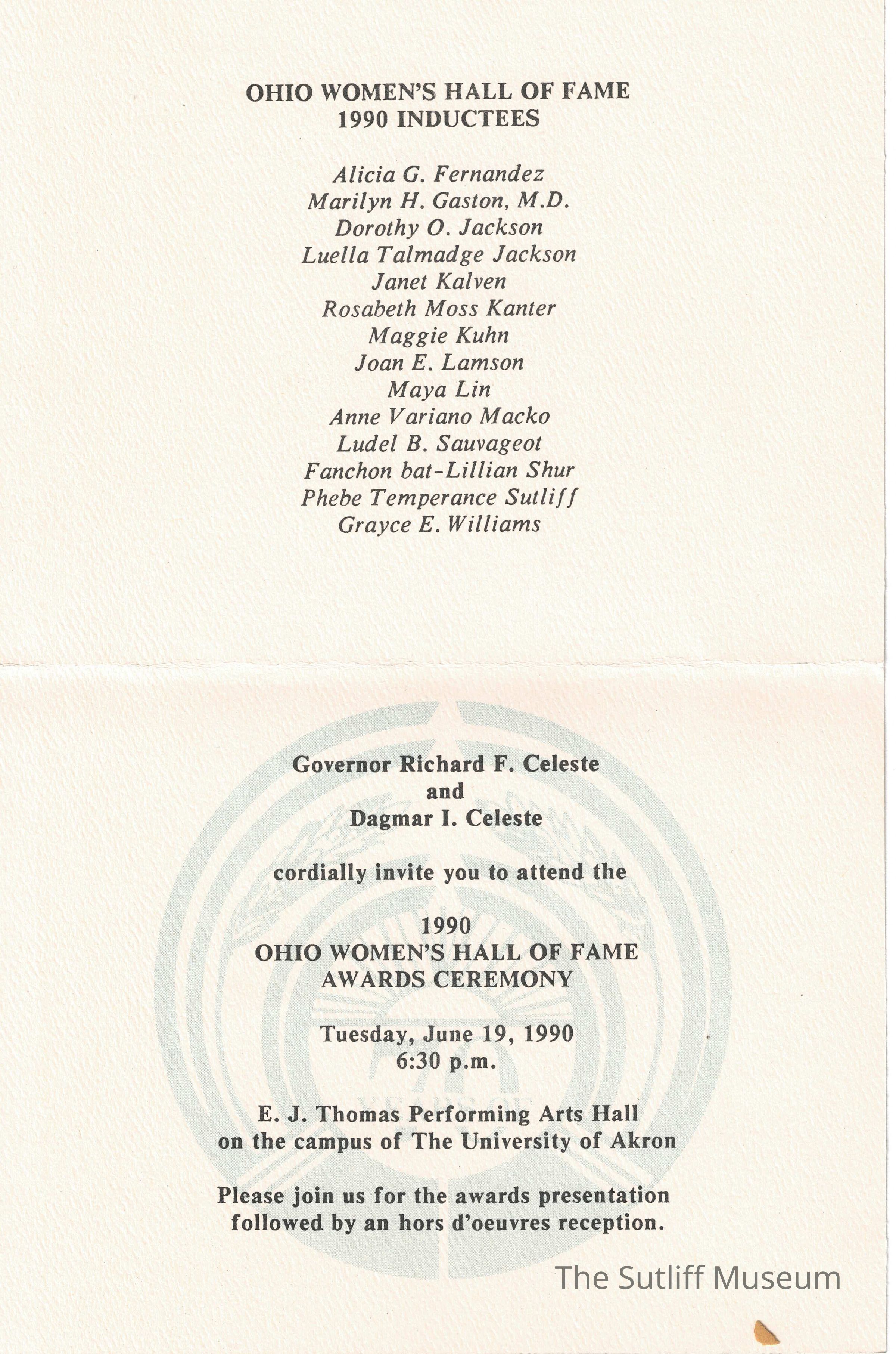 1990 Ohio Women's Hall of Fame InvitationEntry/Object ID