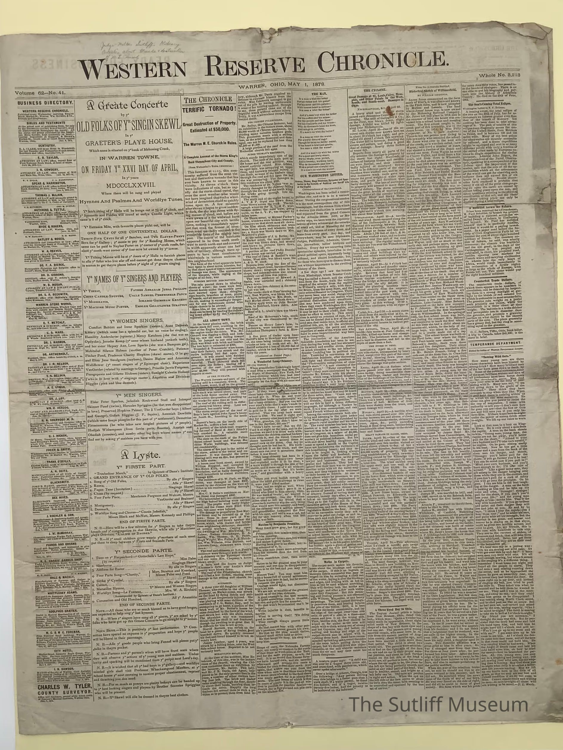 Western Reserve Chronicle newspaper published on May 1, 1878. This edition discusses the recent tornado, obituary for Milton Sutliff and article from Women's Temperance League.Collection