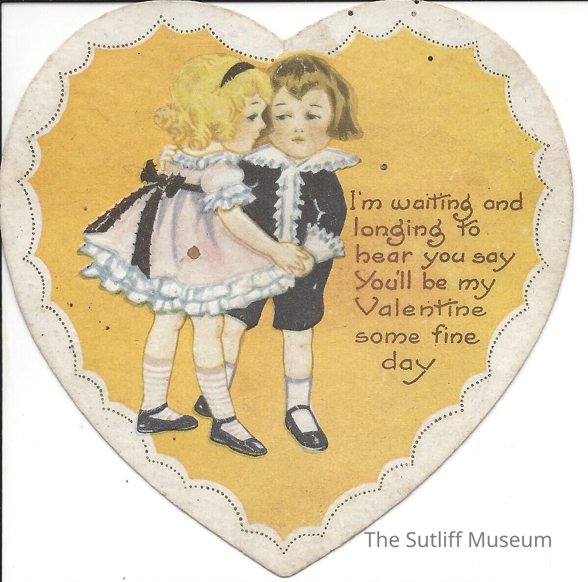 Heart shaped single side Valentine card. On the front is depiction of young boy and girl on yellow background. Text reads, "I'm waiting and longing to hear you say you'll be my Valentine some fine day." Yellow background is bordered by white and single row of small black dots. On reverse written in pencil: To Lytton Blass from Arthur Dyson 1924." Publication note reads "Whitney Made Worchester Mass Made in USA"Collection