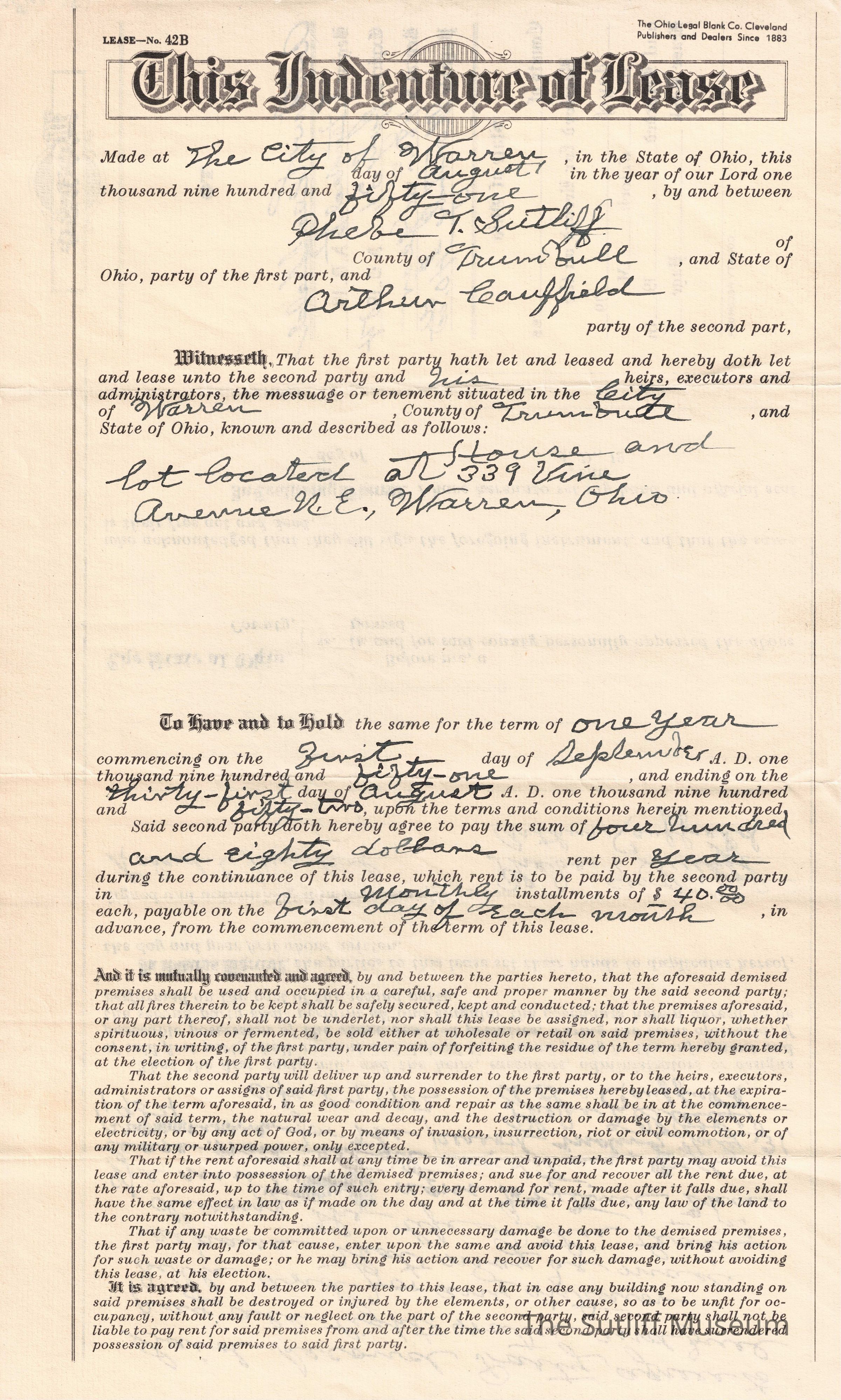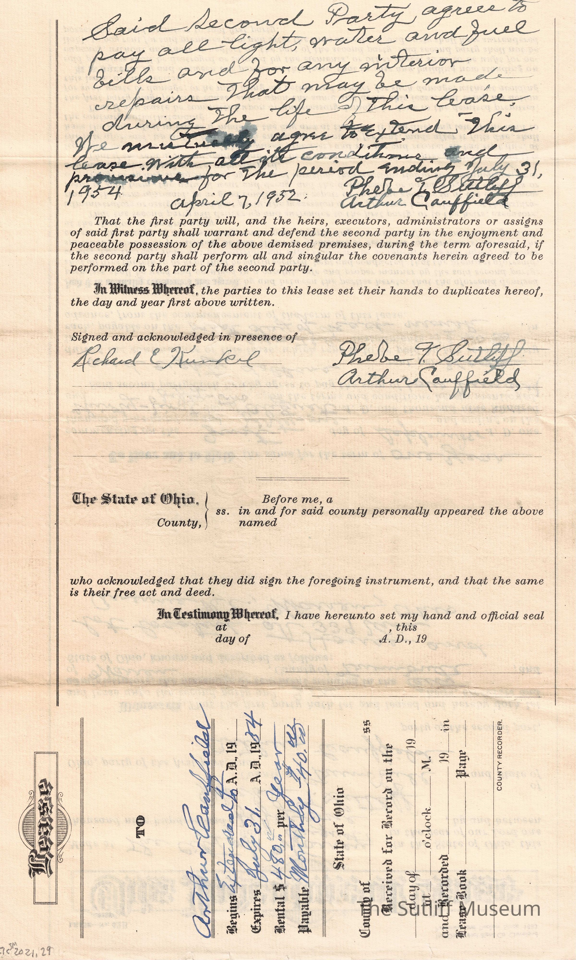An Indenture of Lease between Phebe Temperance Sutliff and Arthur Caulfield to last one year, extending his already existing contract.Relationships
