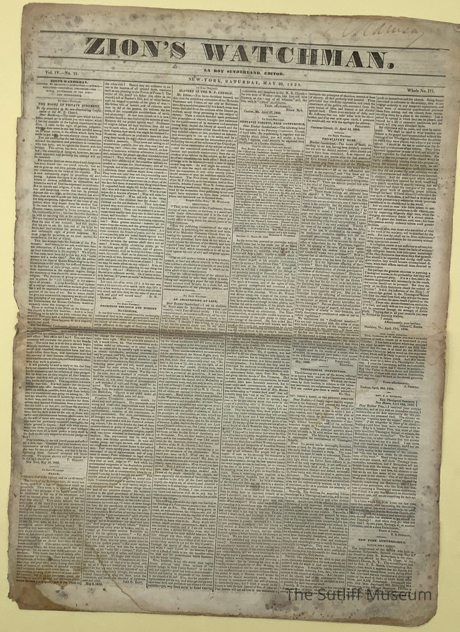 Zion's Watchman Newspaper, published 5/25/1839