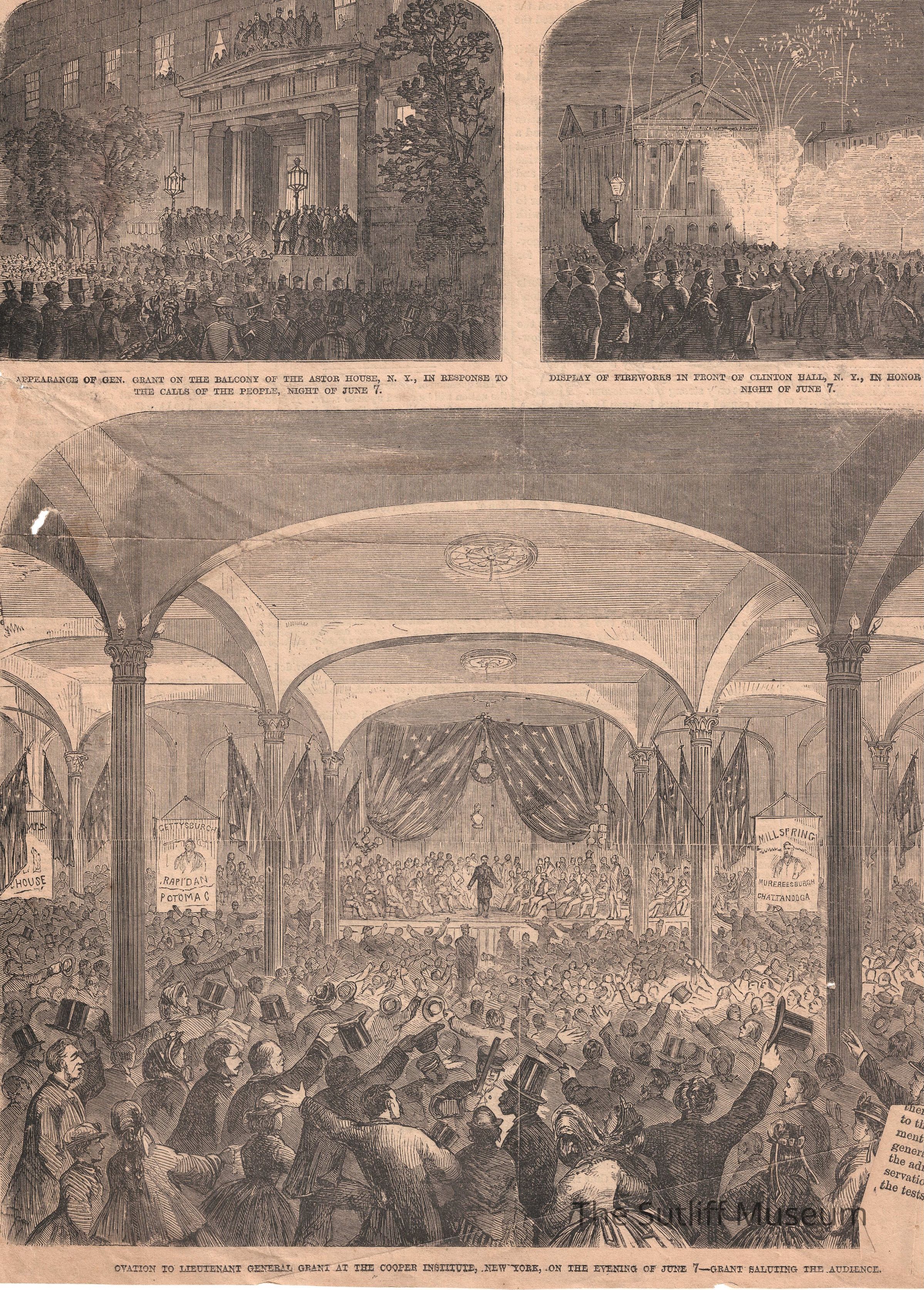 Sketched images from a newspaper titled "Appearance of General Grant on the Balcony of the Astor House", " Display of Fireworks of Clinton Hall", and "Ovation to Lieutenant General Grant At the Cooper Institute, New York, On the Evening of June 7- Grant Saluting the Audience." Undated.Collection