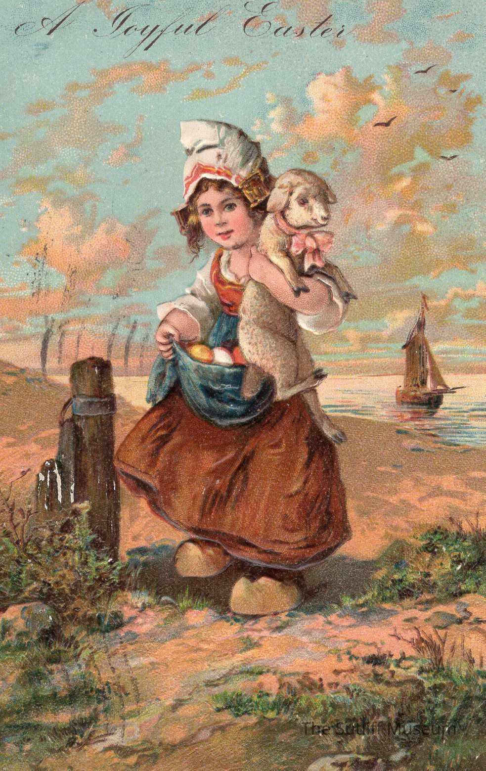 A postcard of a girl with a sheep an the phrase "A Joyful Easter"Collection