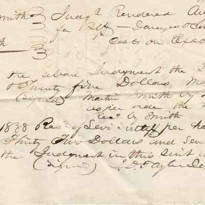 A receipt from the legal case of Martin Smith v. Levi Smith and the exchange between Levi Sutliff and Calvin Granger Sutliff.
