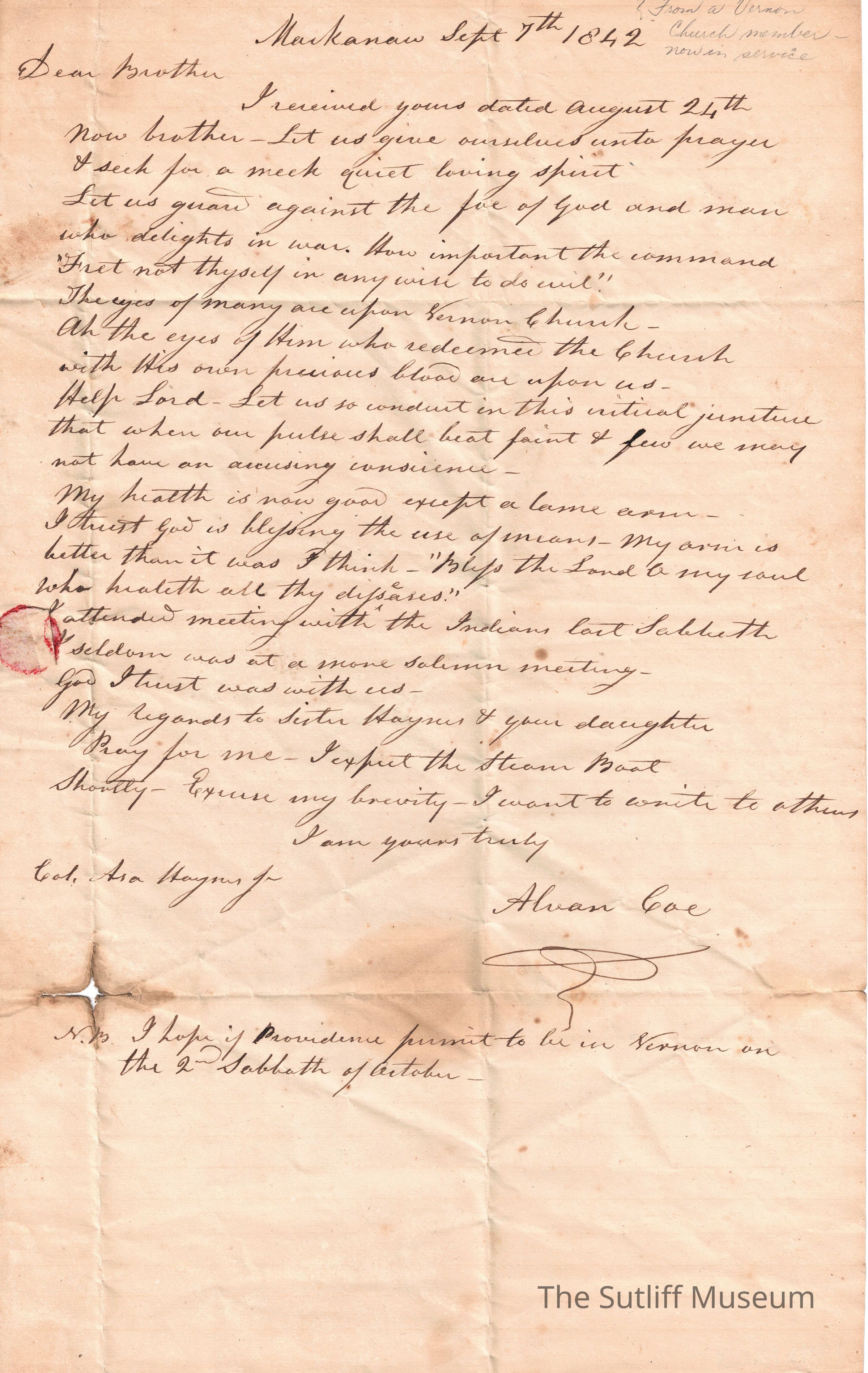 A letter from Alvan Coe, a Vernon Church Member, to his brother regarding religion and his health.Relationships
