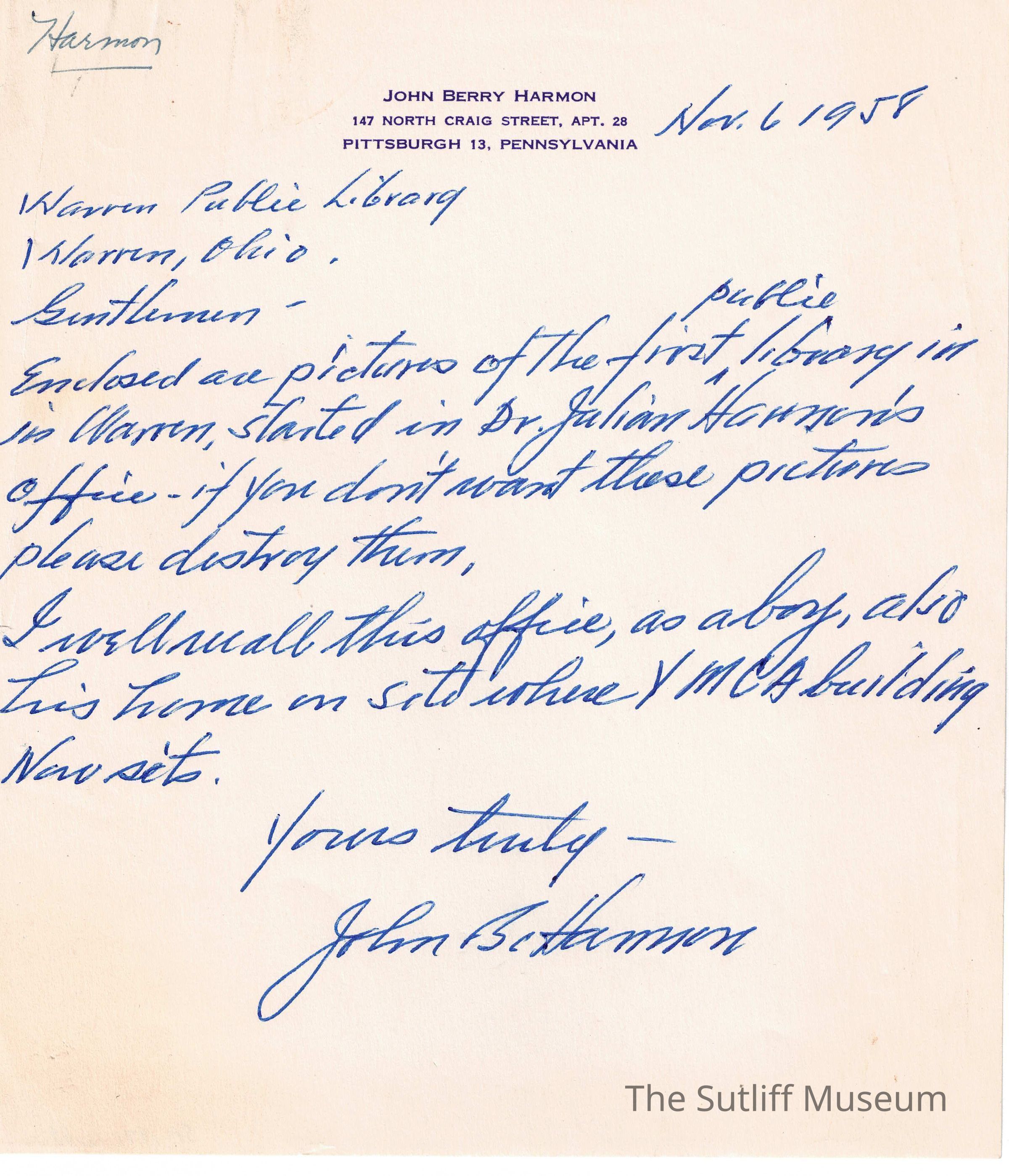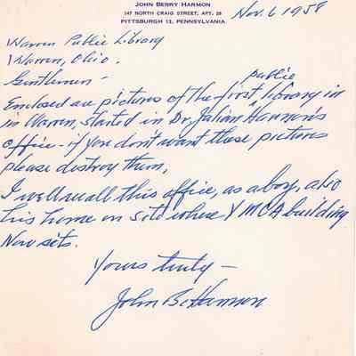 A letter from John Berry Harmon to the gentlemen of the Warren Public Library regarding a picture of the first library in Warren.Relationships