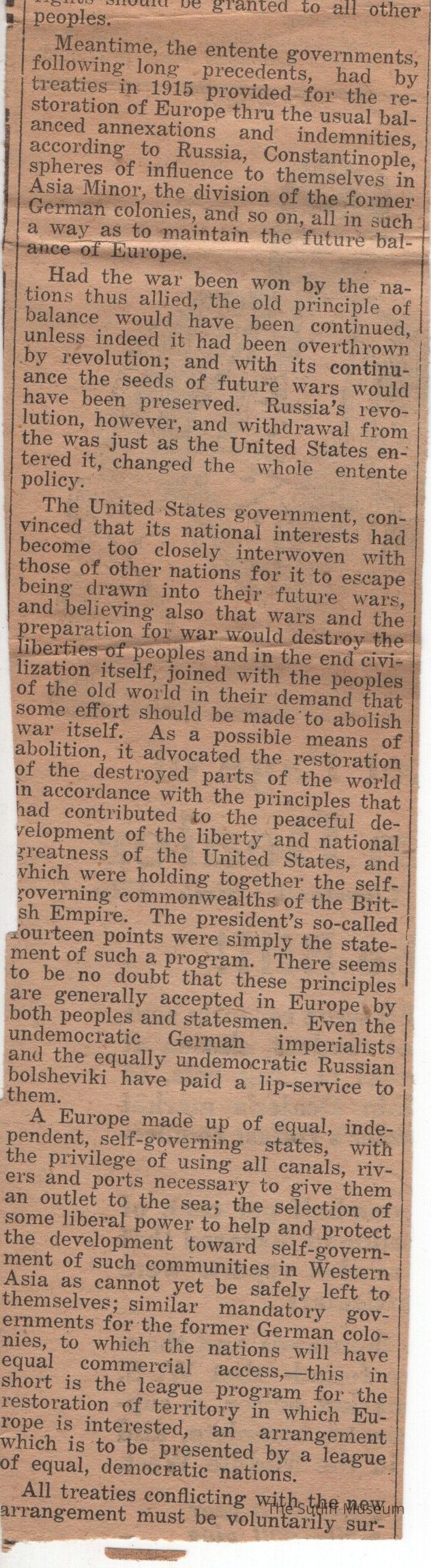 An article titled "The League of Nations" by Phebe T. Sutliff Dated 3/27/1919Collection