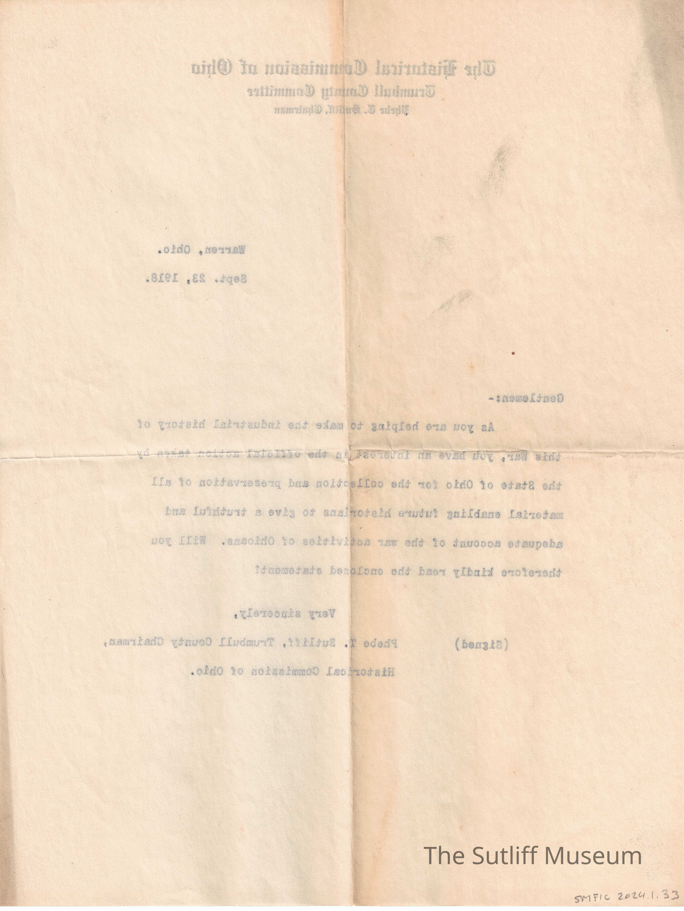 P.T. Sutliff to Historical Commission of OhioEntry/Object ID