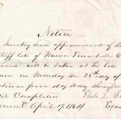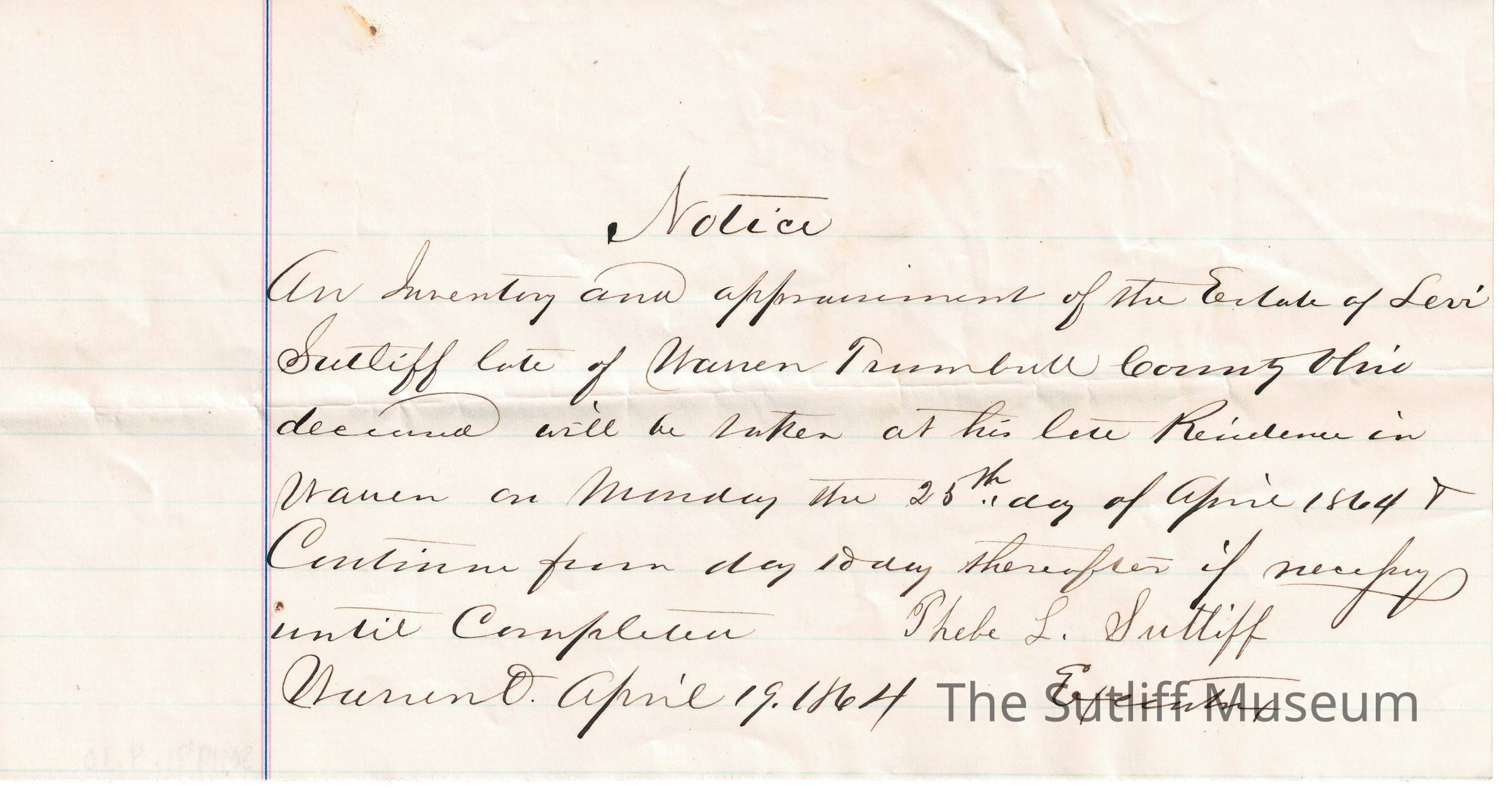 A notice from Phebe Lord Marvin Sutliff regarding where Levi Sutliff will be on specific dates.Collection