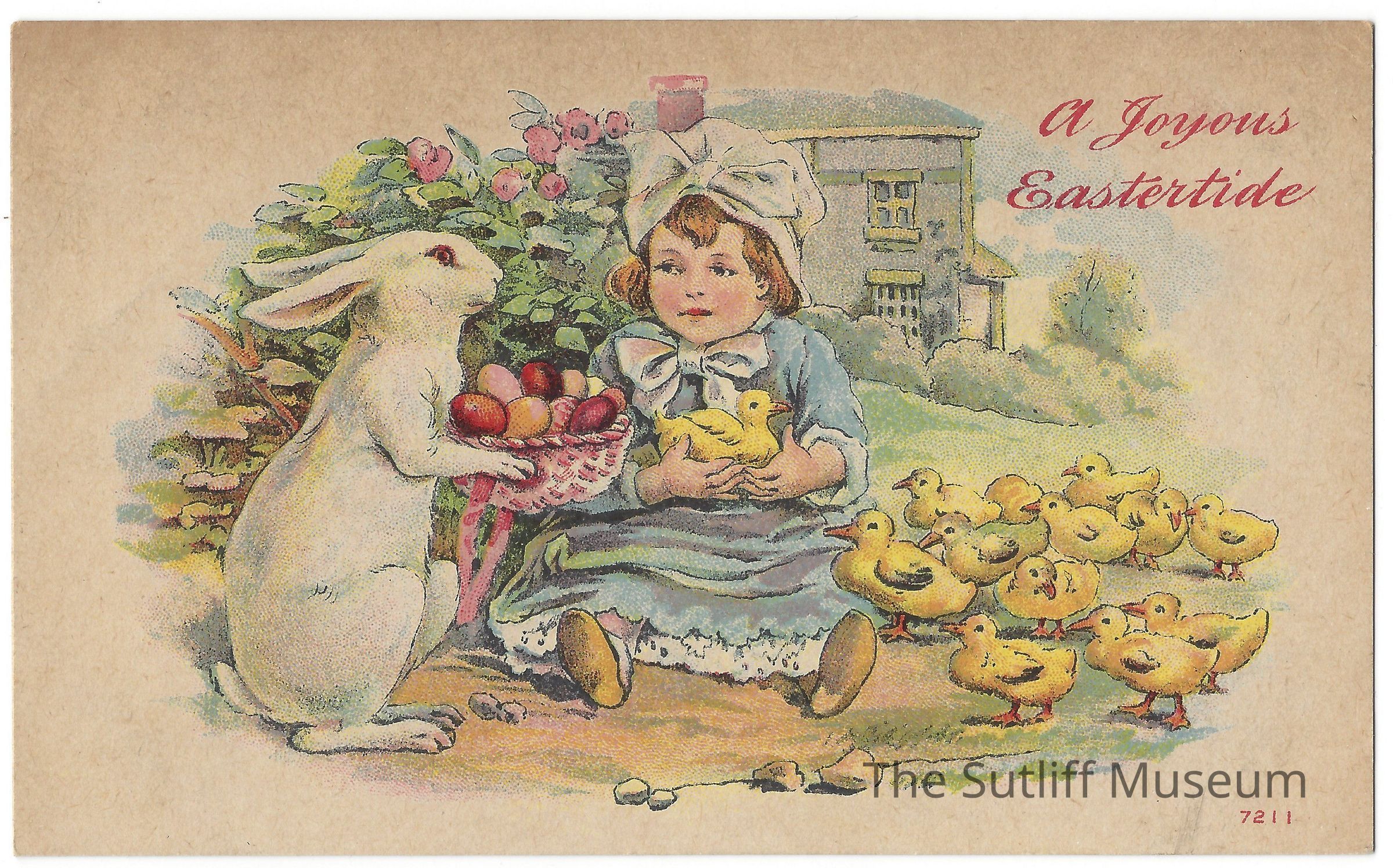 Easter postcard that depicts a little girl, a white rabbit holding a basket of eggs, and ducks.