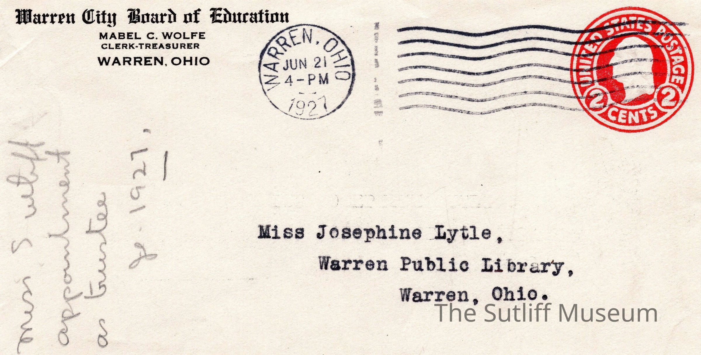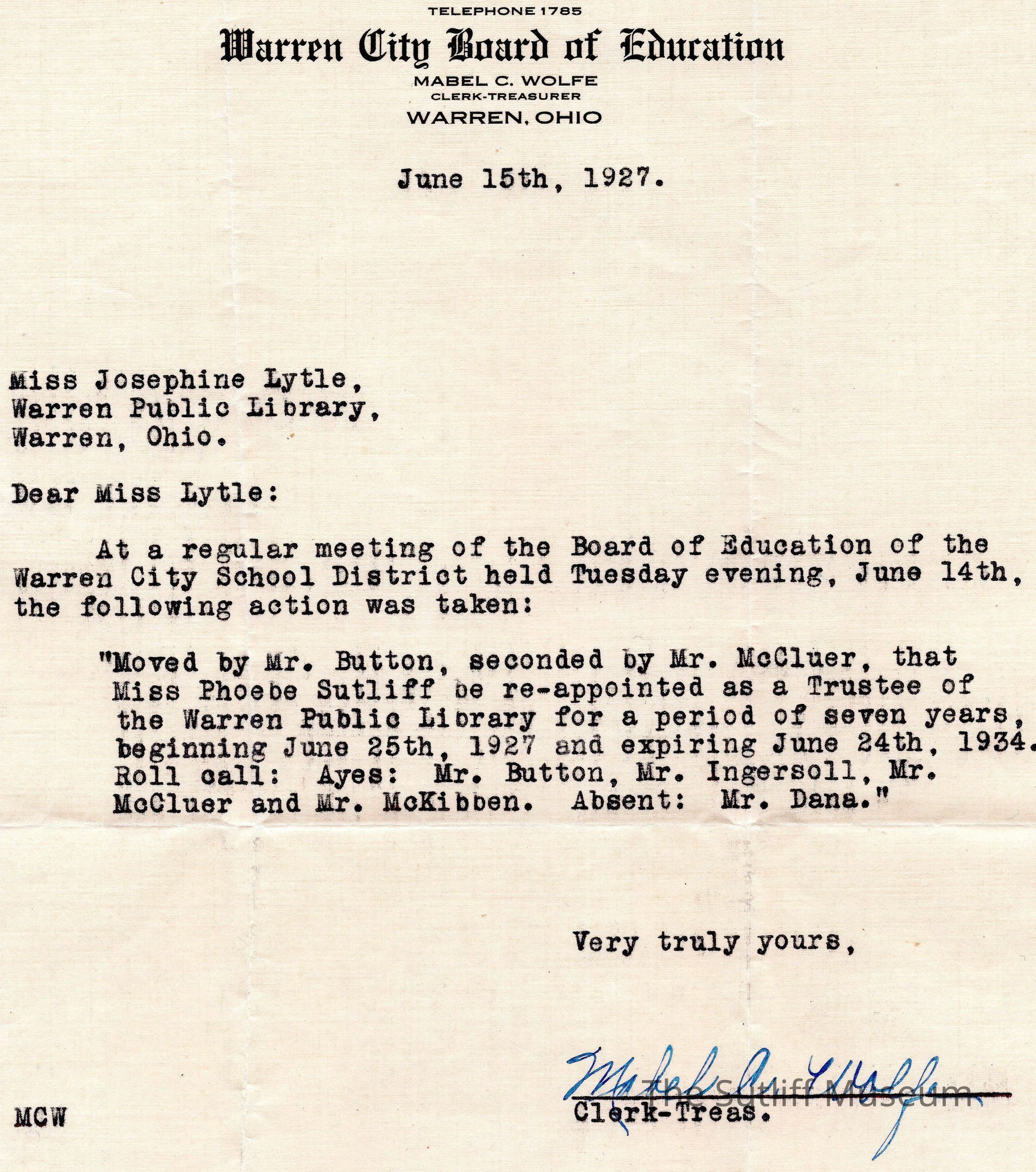 A letter from Mabel C. Wolf to Miss Josephine Lytle regarding the actions taken during a meeting of the Board of Education of the Warren City School District where Phebe Sutliff was re-appointed as a Trustee of the Warren Public Library.Relationships